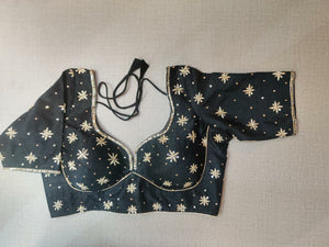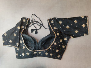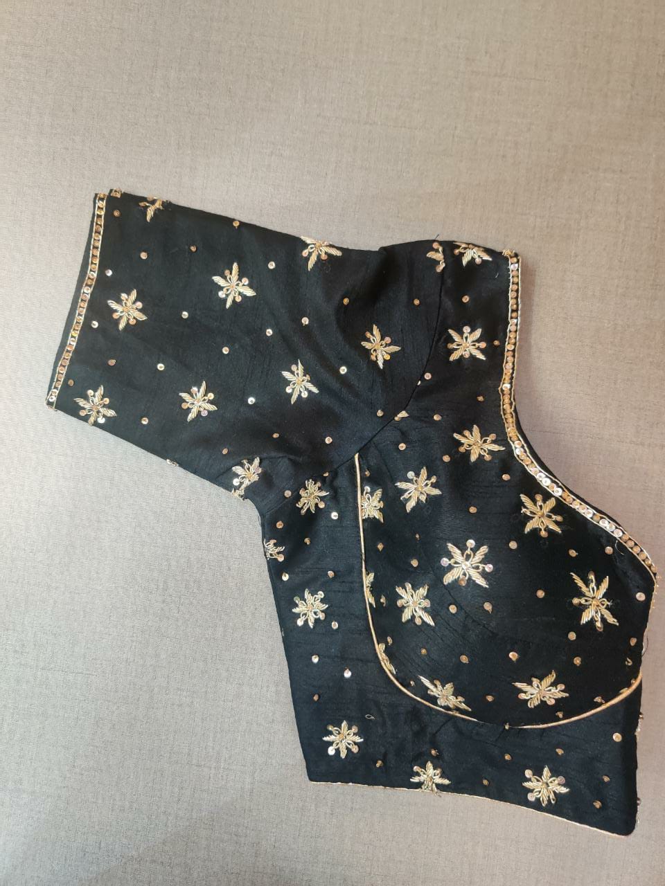 Beautiful black designer saree blouse with embroidered floral motifs. Buy designer blouse in USA from Pure Elegance.