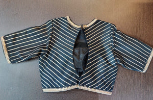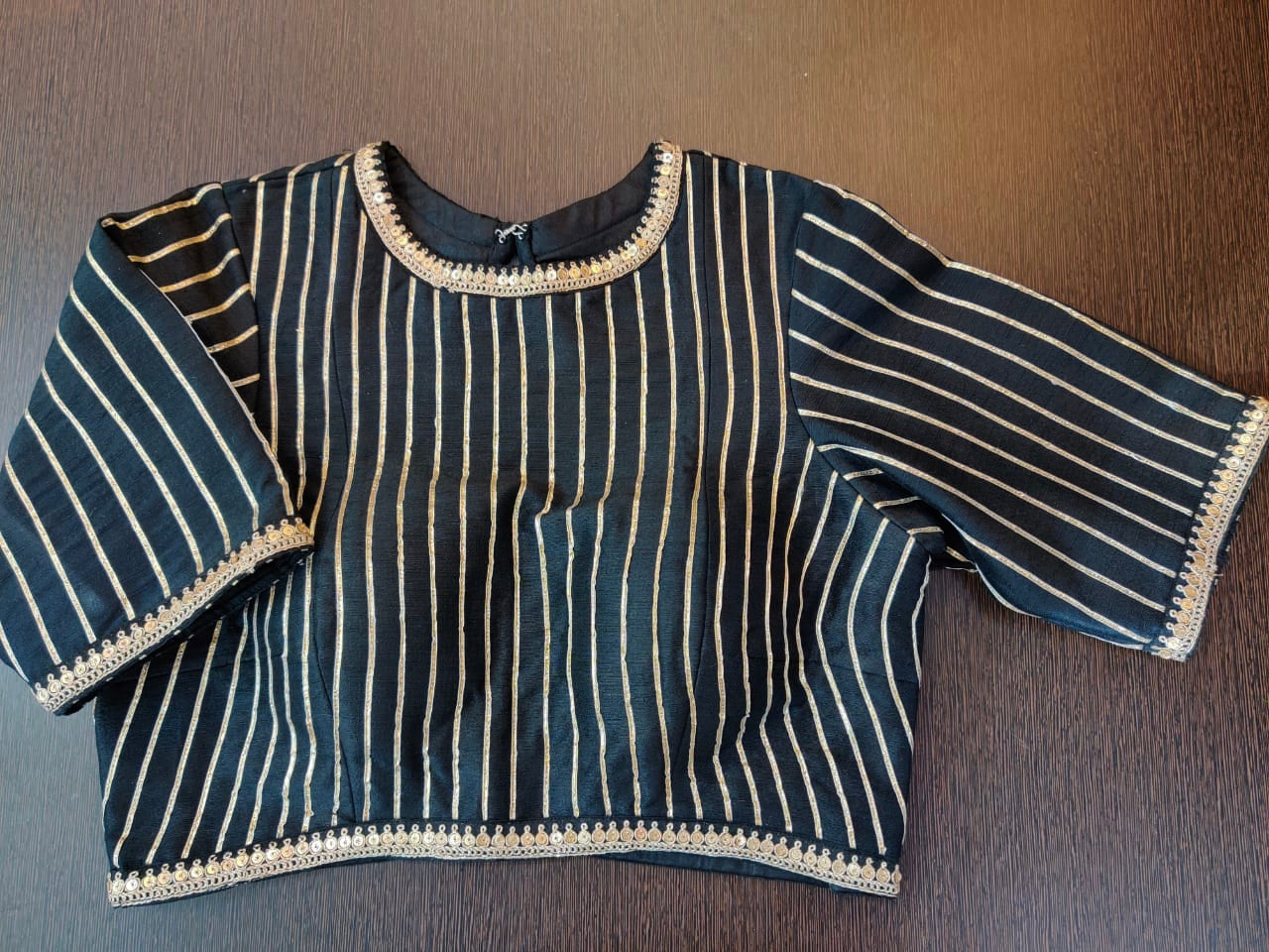 Stunning black gota embellished designer saree blouse with embroidered neckline. Shop designer saree blouse online in USA from Pure Elegance.