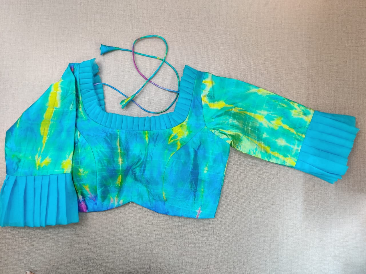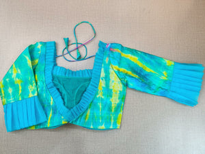 Stunning blue and green tie and dye sari blouse with frill sleeves. Buy designer blouse in USA from Pure Elegance.
