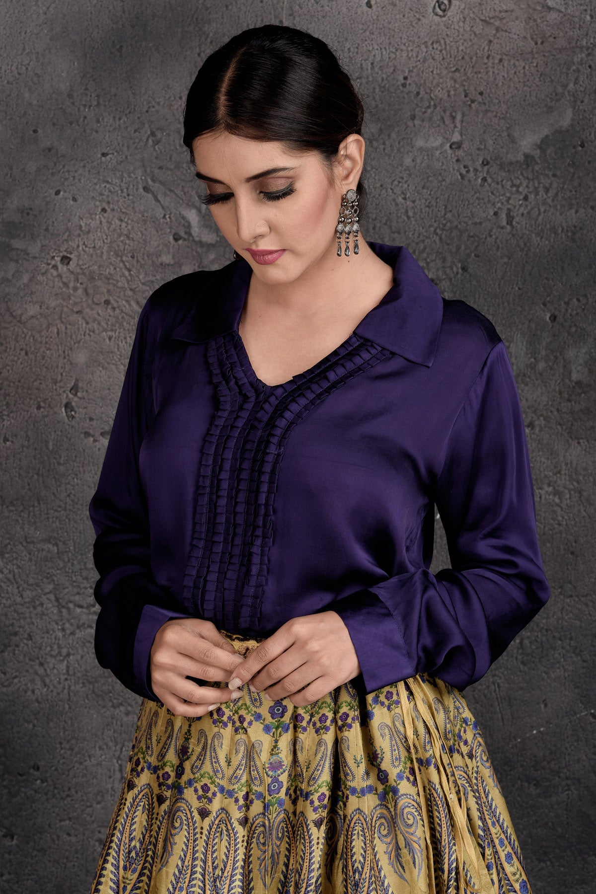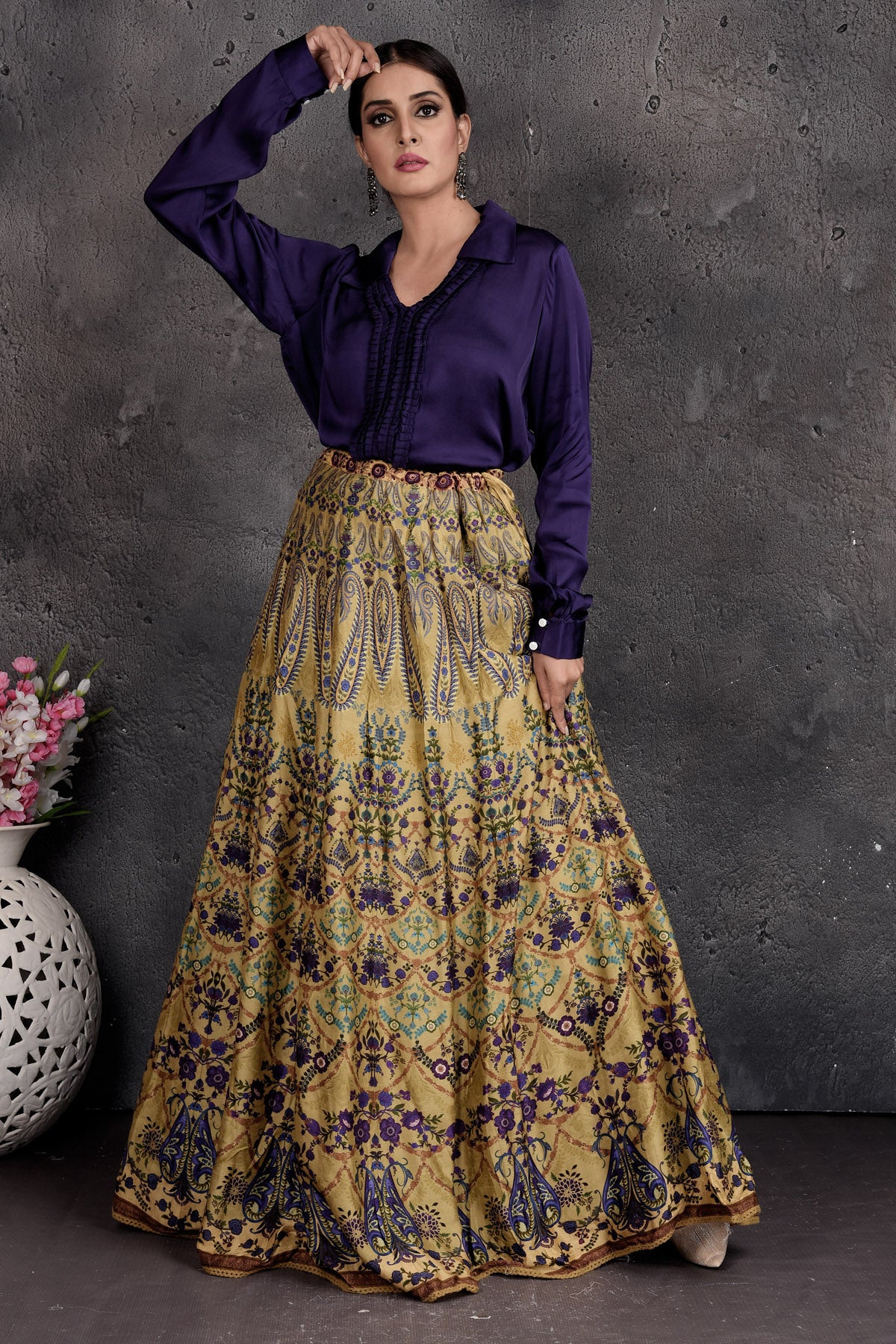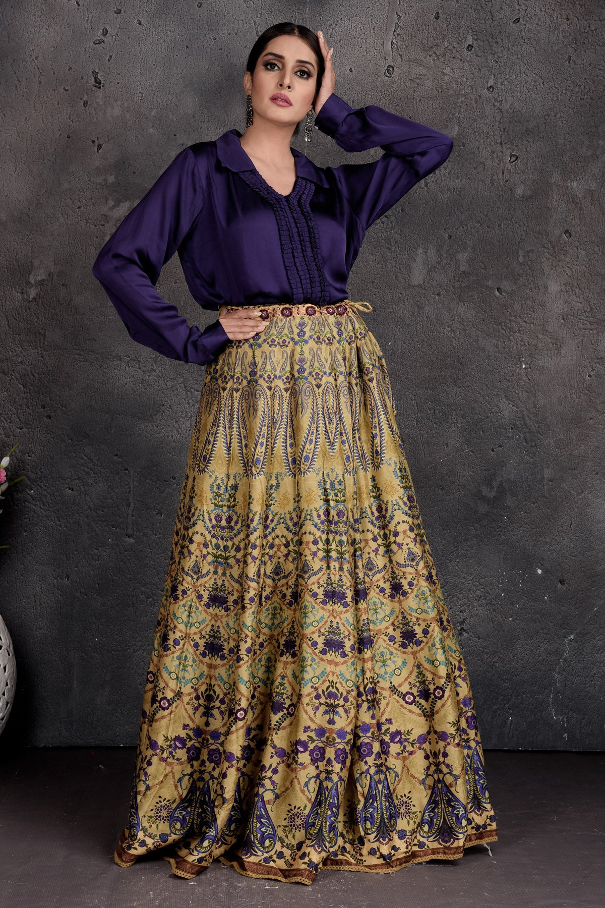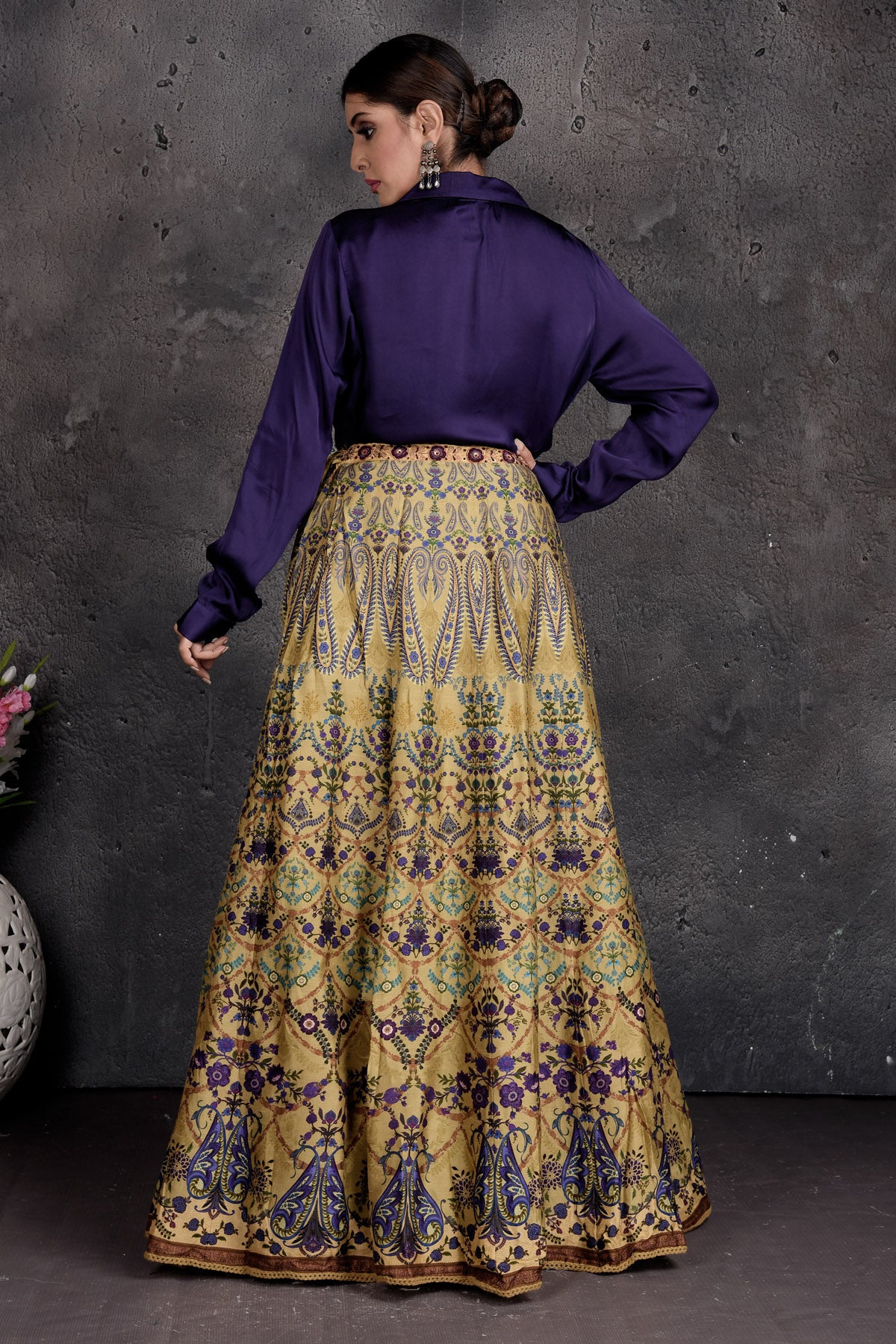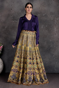 Dance the night away in this stunning blue and yellow printed shirt lehenga. Shop designer lehengas in USA from Pure Elegance.