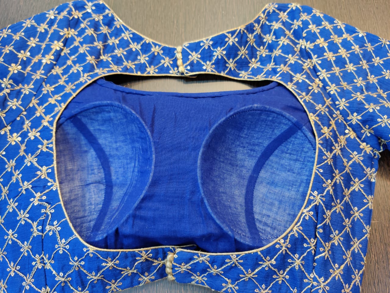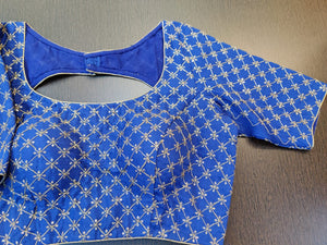 Stunning blue embroidered readymade saree blouse. Buy online from Pure Elegance