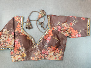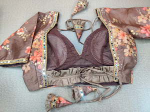 Beautiful brown floral print embroidered saree blouse with mirror work. Buy designer blouse in USA from Pure Elegance.