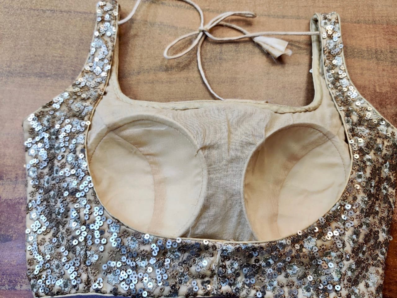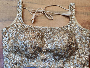 Stunning golden embroidered sequin designer saree blouse. Buy online from Pure Elegance.