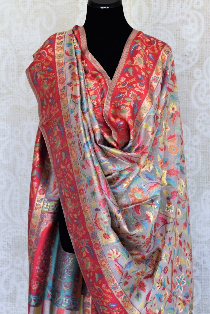 Beautiful handcrafted grey and multicolor Kani dupatta.