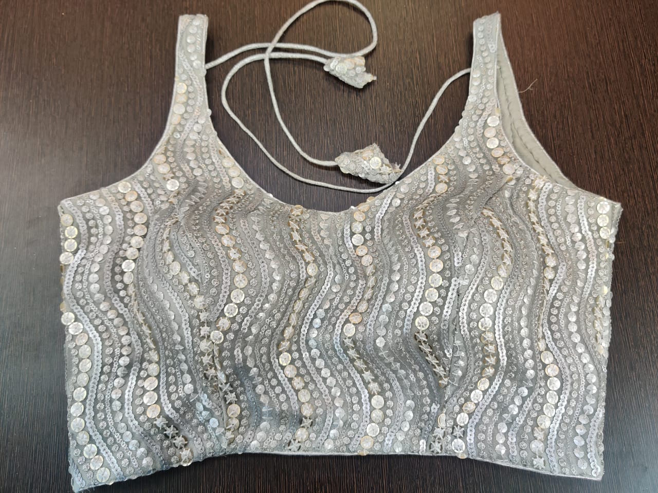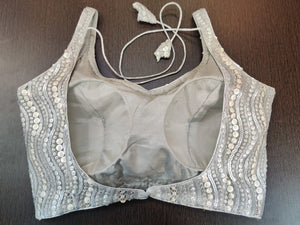 Stunning grey embellished sleeveless saree blouse. Buy designer blouse in USA from Pure Elegance.