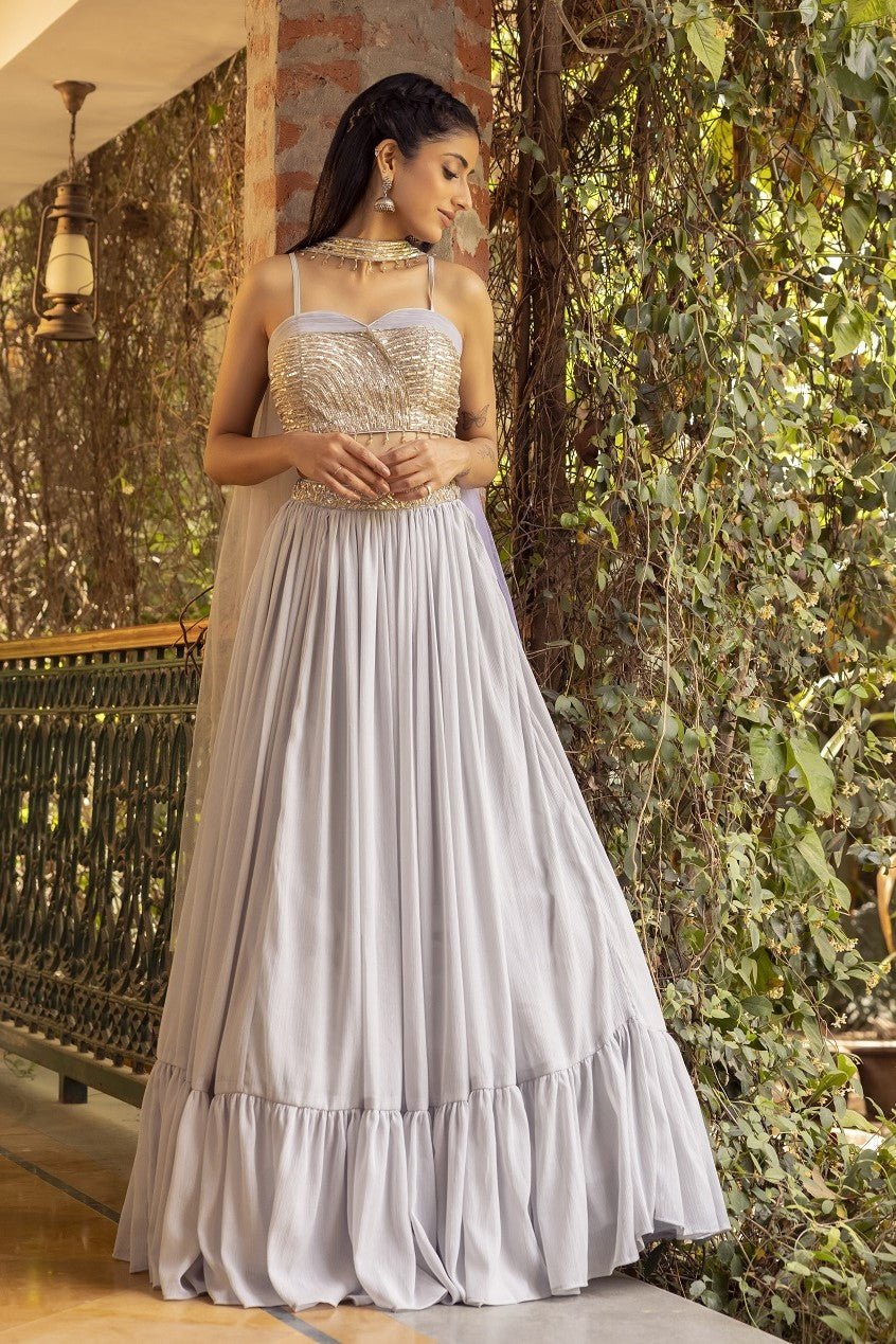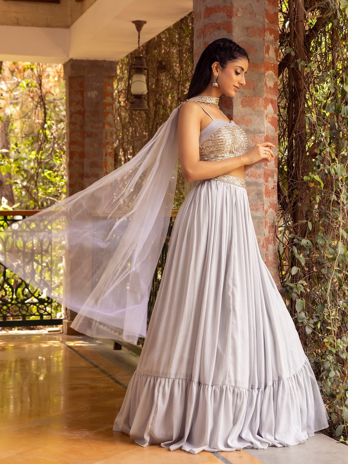 Beautiful grey georgette strappy lehenga with dupatta. The lehenga is crafted in georgette with sequin embroidery. It is perfect for weddings and festive occasions. Shop online from Pure Elegance.