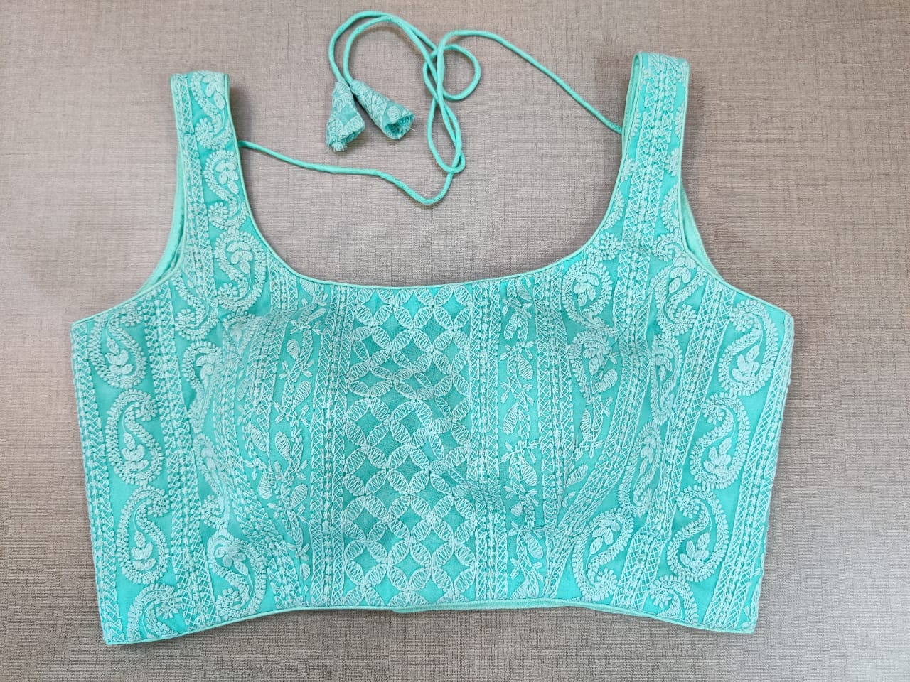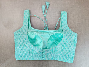 Beautiful light blue embroidered sleeveless saree blouse . Buy designer blouse in USA from Pure Elegance.