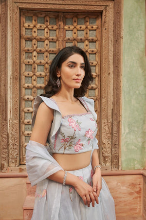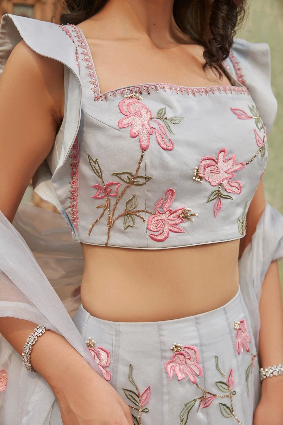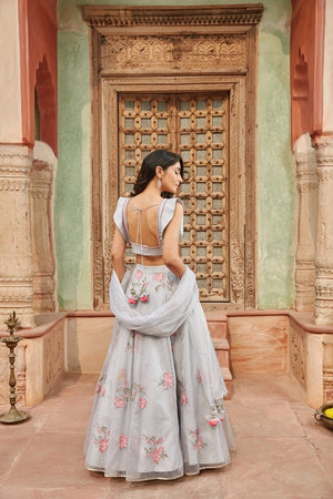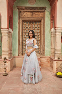 Stunning light grey embroidered lehenga set with dupatta. The lehenga is a perfect choice for weddings, sangeet and mehendi. Buy online from Pure Elegance