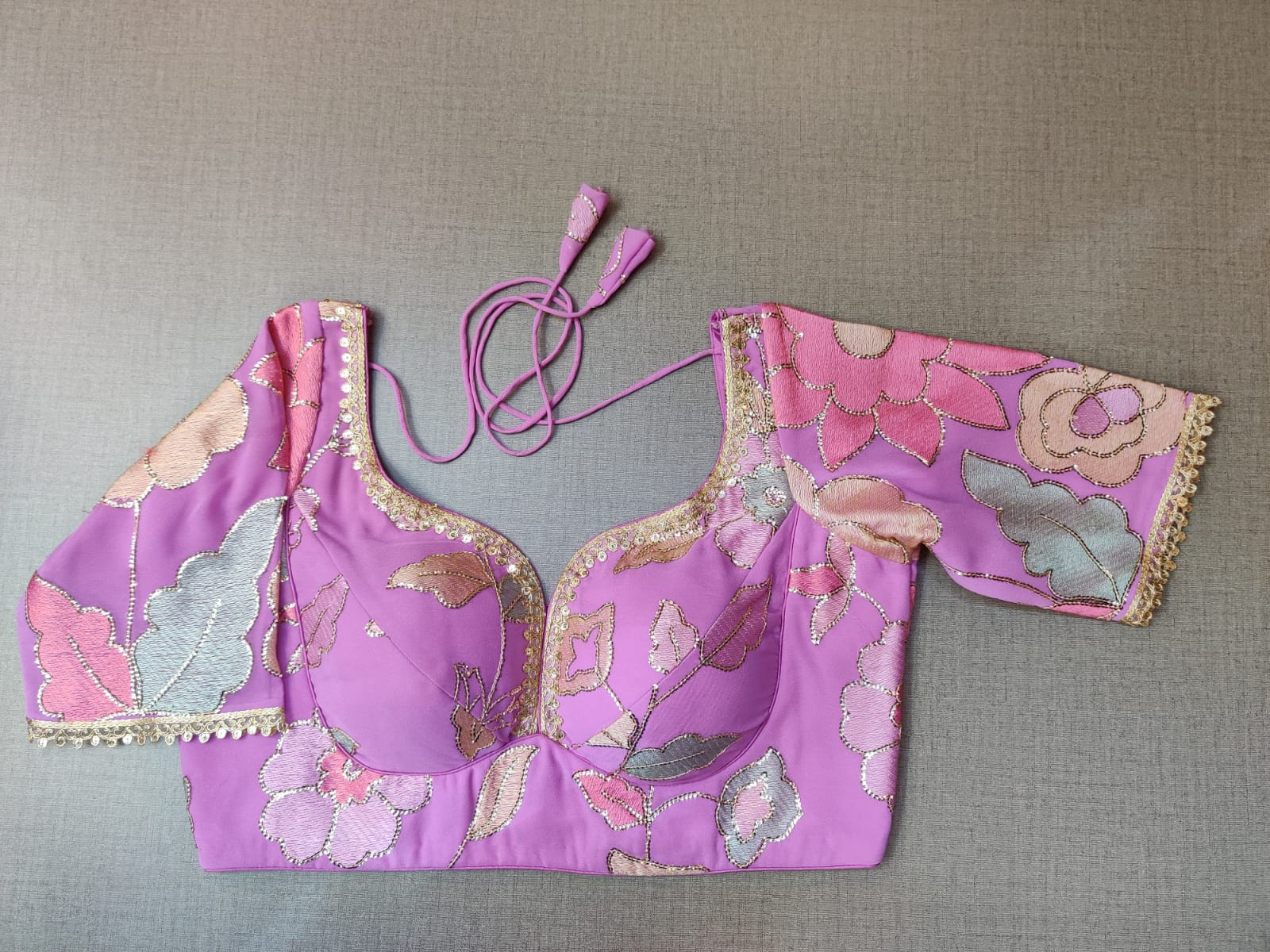 Add a royal touch to your saree look with this stunning lilac embroidered saree blouse with lace. Buy designer blouse in USA from Pure Elegance..