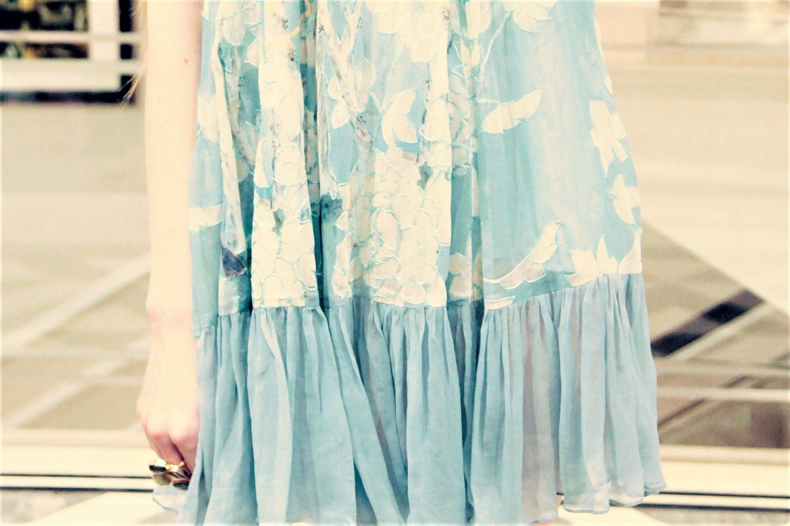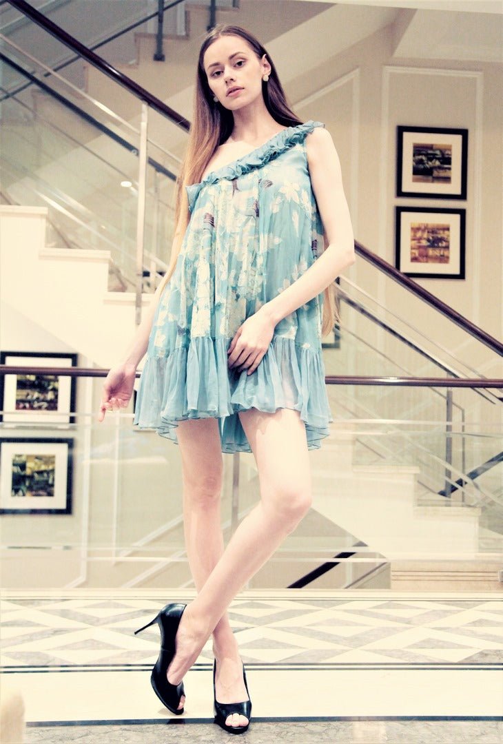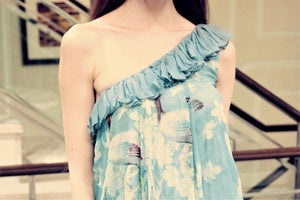 Sizzle at parties in this mint georgette one shoulder georgette dress with digital print and embroidery. The embroidery is done with ari. The motifs of print include leaves and birds. The dress has ruffles at hemline and at the neckline. Shop online at Pure Elegance or visit our store in USA!