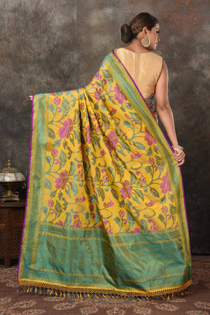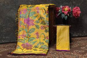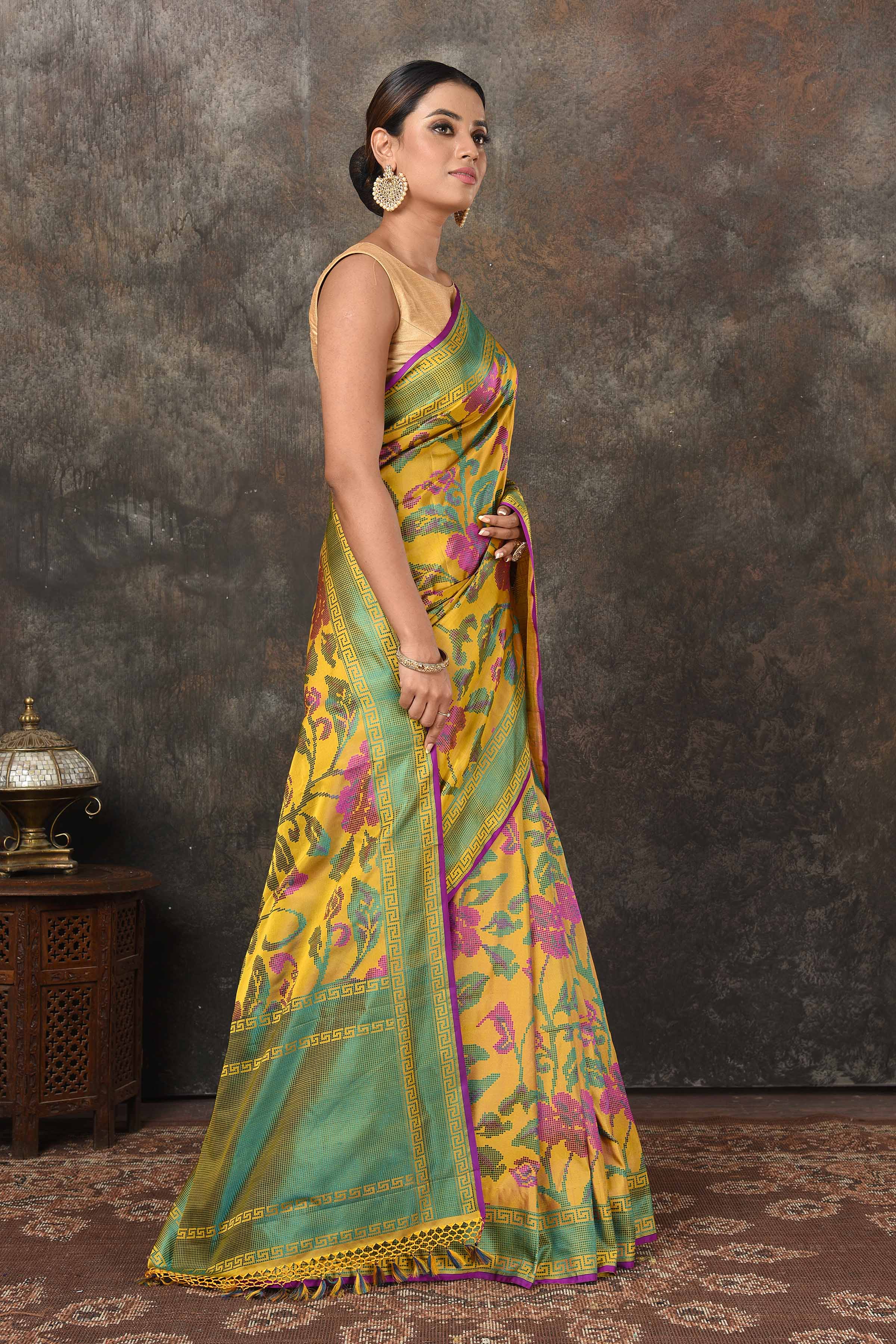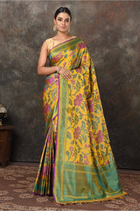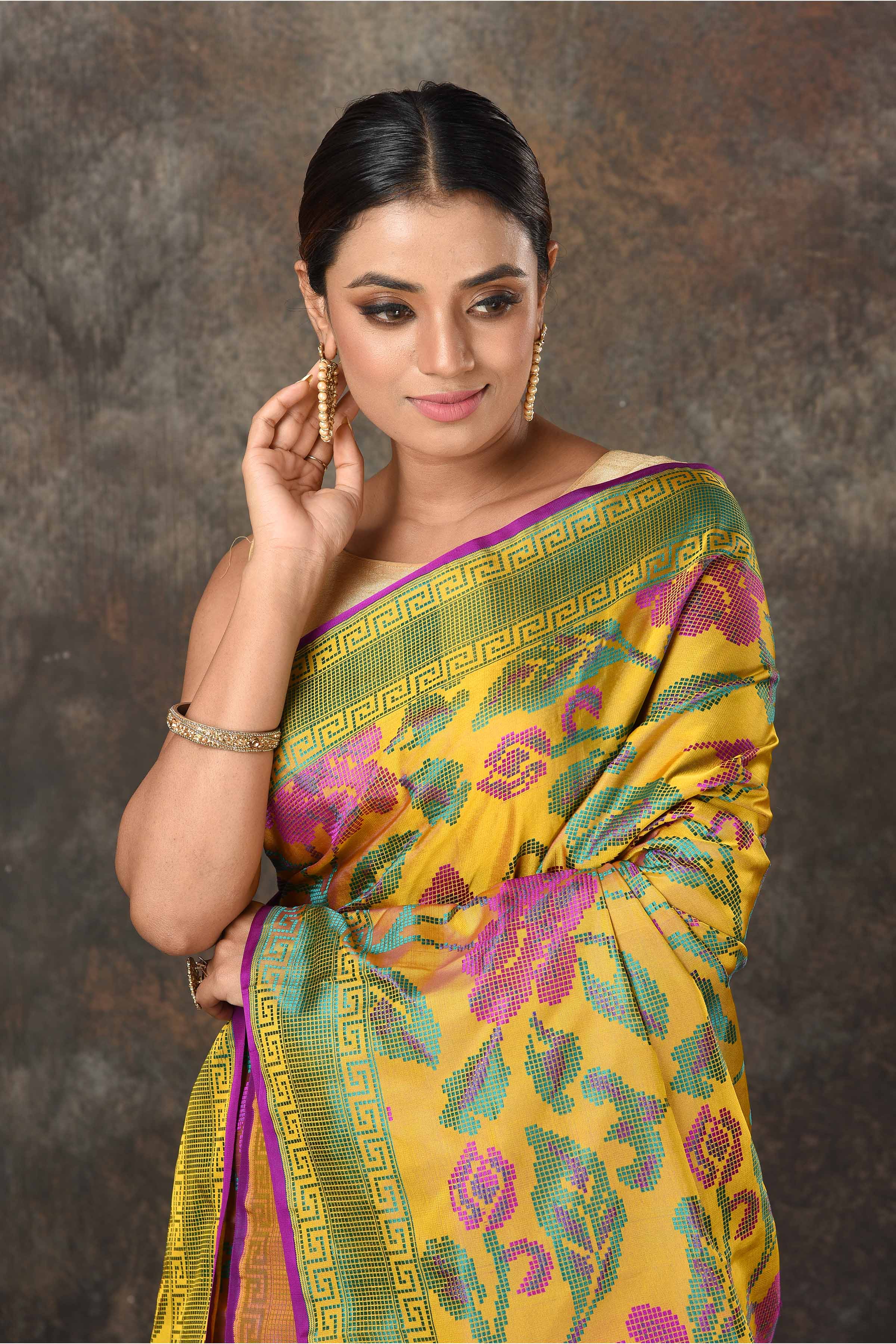 Radiate elegance on special occasions in this stunning mustard satin weave Banarasi saree. It comes with a matching blouse piece.