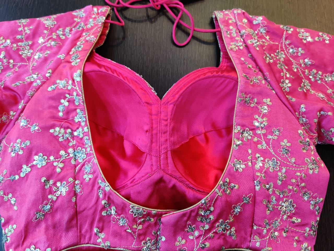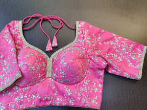 Gorgeous neon pink embroidered designer saree blouse. Buy online from Pure Elegance