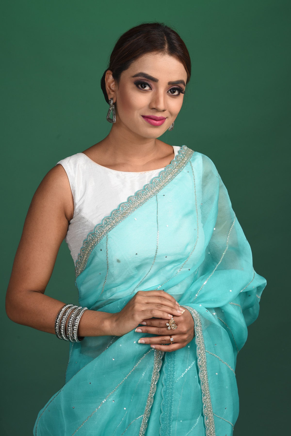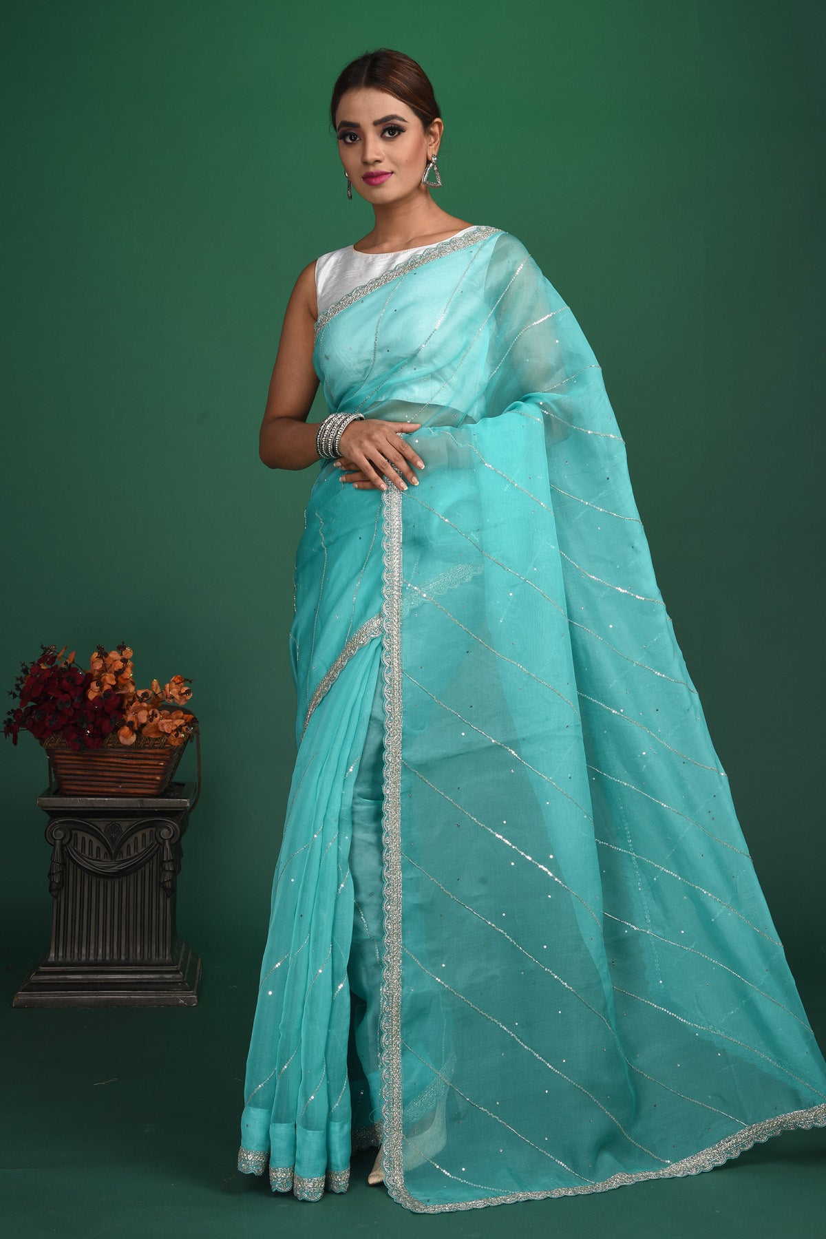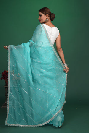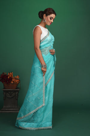 Be a vision of elegance at weddings and parties in this beautiful pastel green embroidered organza sari. It comes with a matching blouse piece. Shop designer sarees online in USA from Pure Elegance.