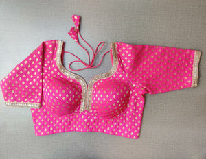 Beautiful pink embroidered Banarasi saree blosue. Buy designer blouse in USA from Pure Elegance.