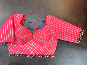 Stunning pink gota lace saree blouse with golden tassels. Buy designer blouse in USA from Pure Elegance.