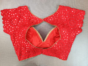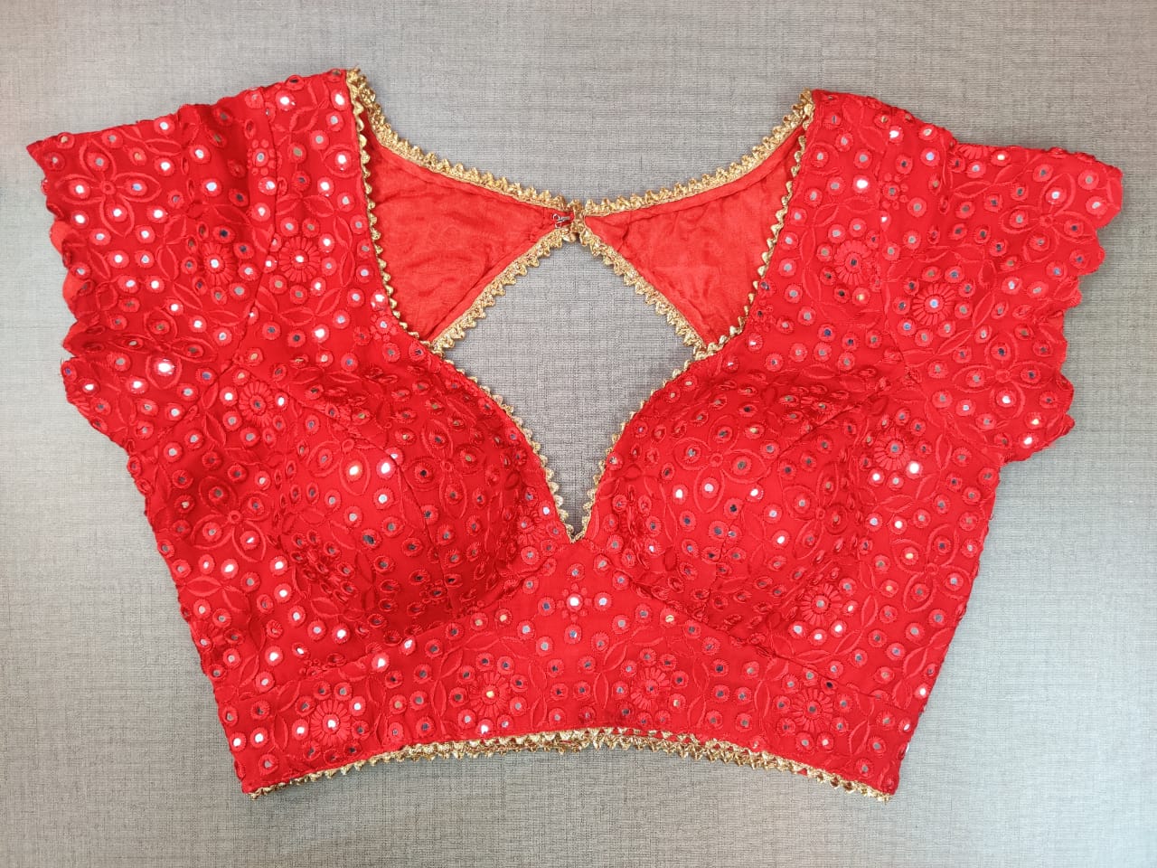 Beautiful red mirror work designer saree blouse. Buy designer blouse in USA from Pure Elegance.