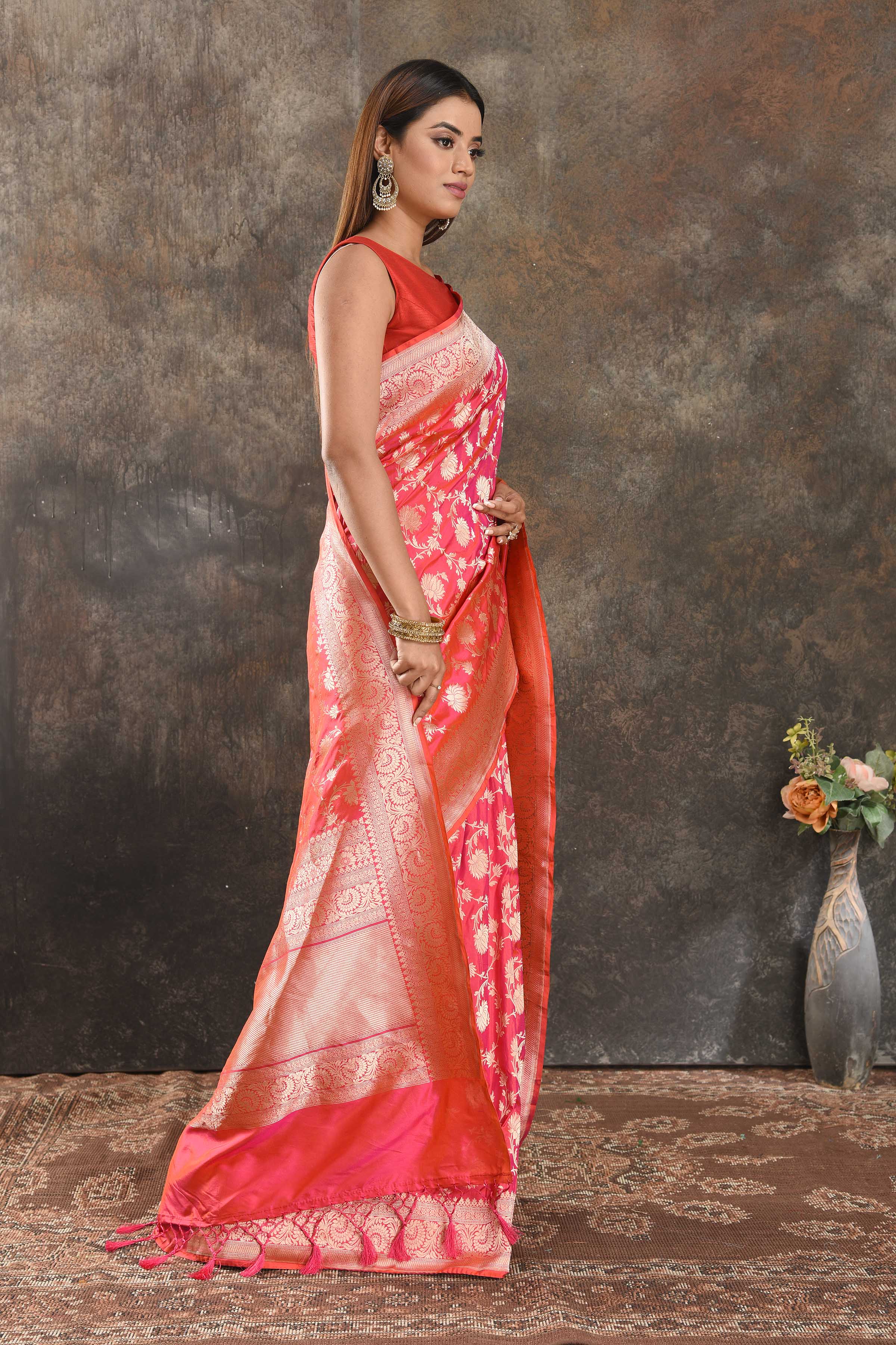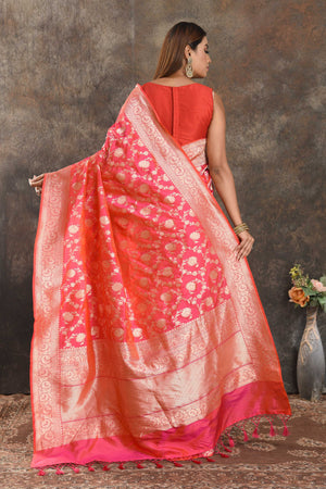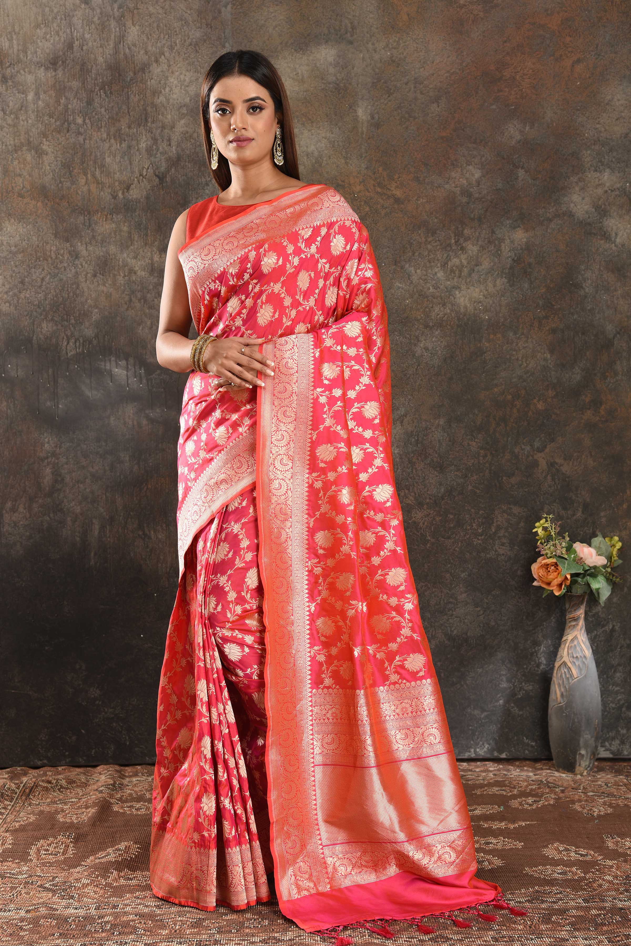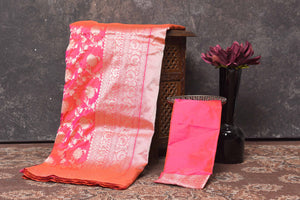 Be vision of elegance on special occasions in this beautiful bright pink silk saree. The saree is enhanced with overall zari jaal, zari border and pallu. It comes with a matching blouse piece.
