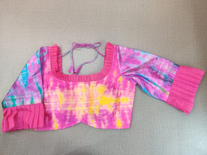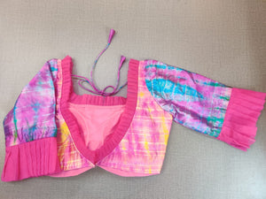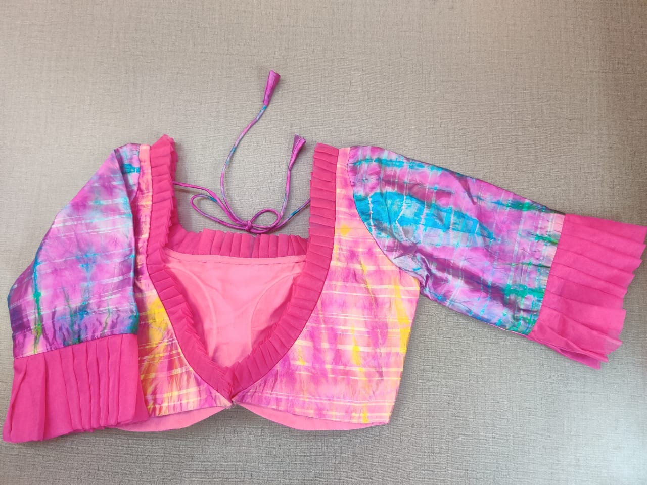 Stunning pink tie and dye sari blouse with frill sleeves. Buy designer blouse in USA from Pure Elegance.
