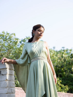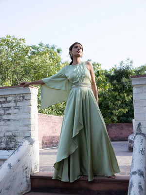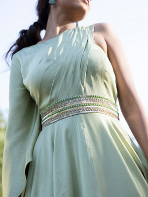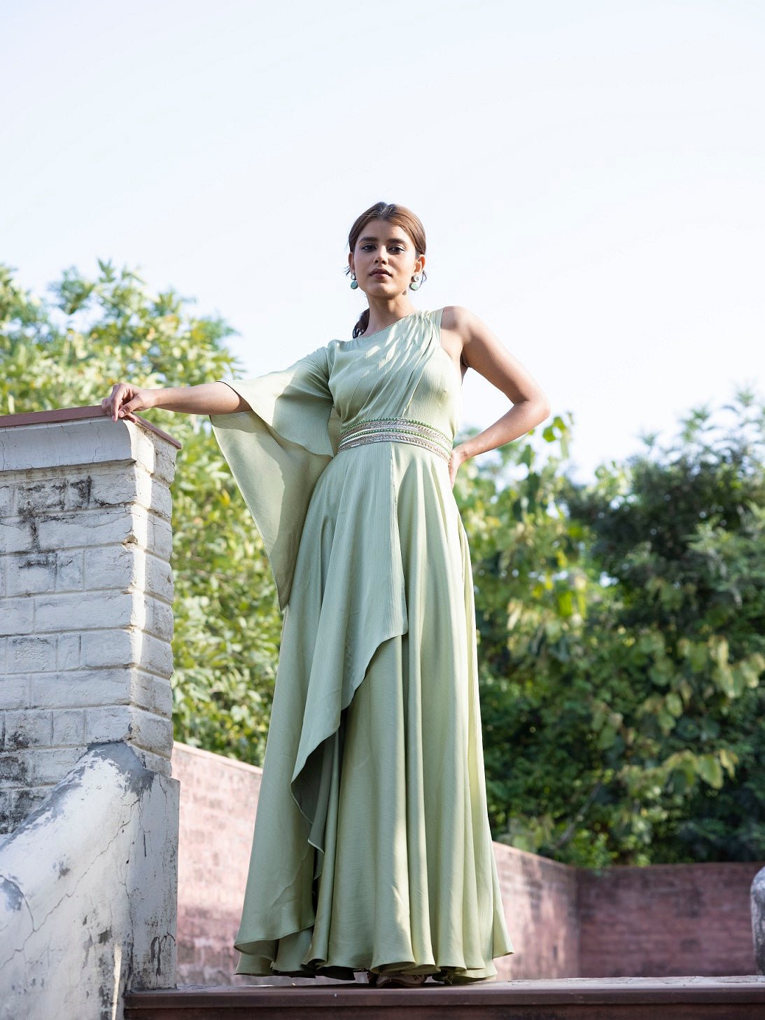 Beautiful and contemporary pista green georgette one shoulder gown. Shop online from Pure Elegance.