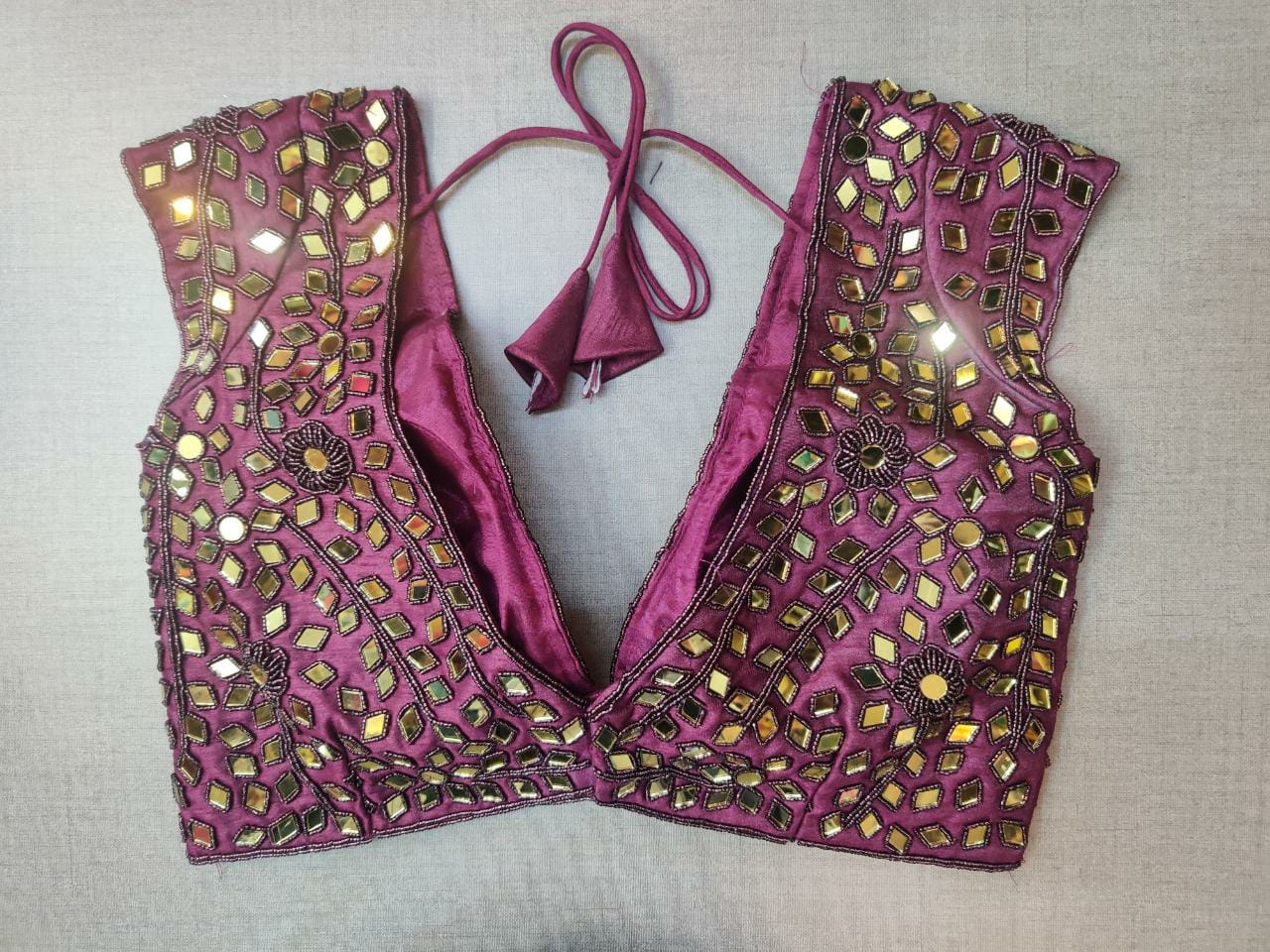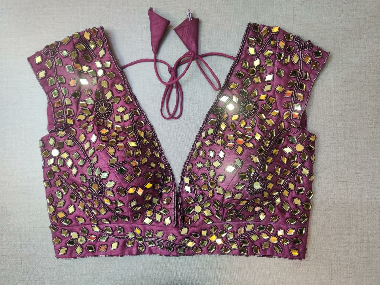 Beautiful purple overall mirror work saree blouse. Buy designer blouse in USA from Pure Elegance.