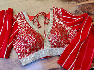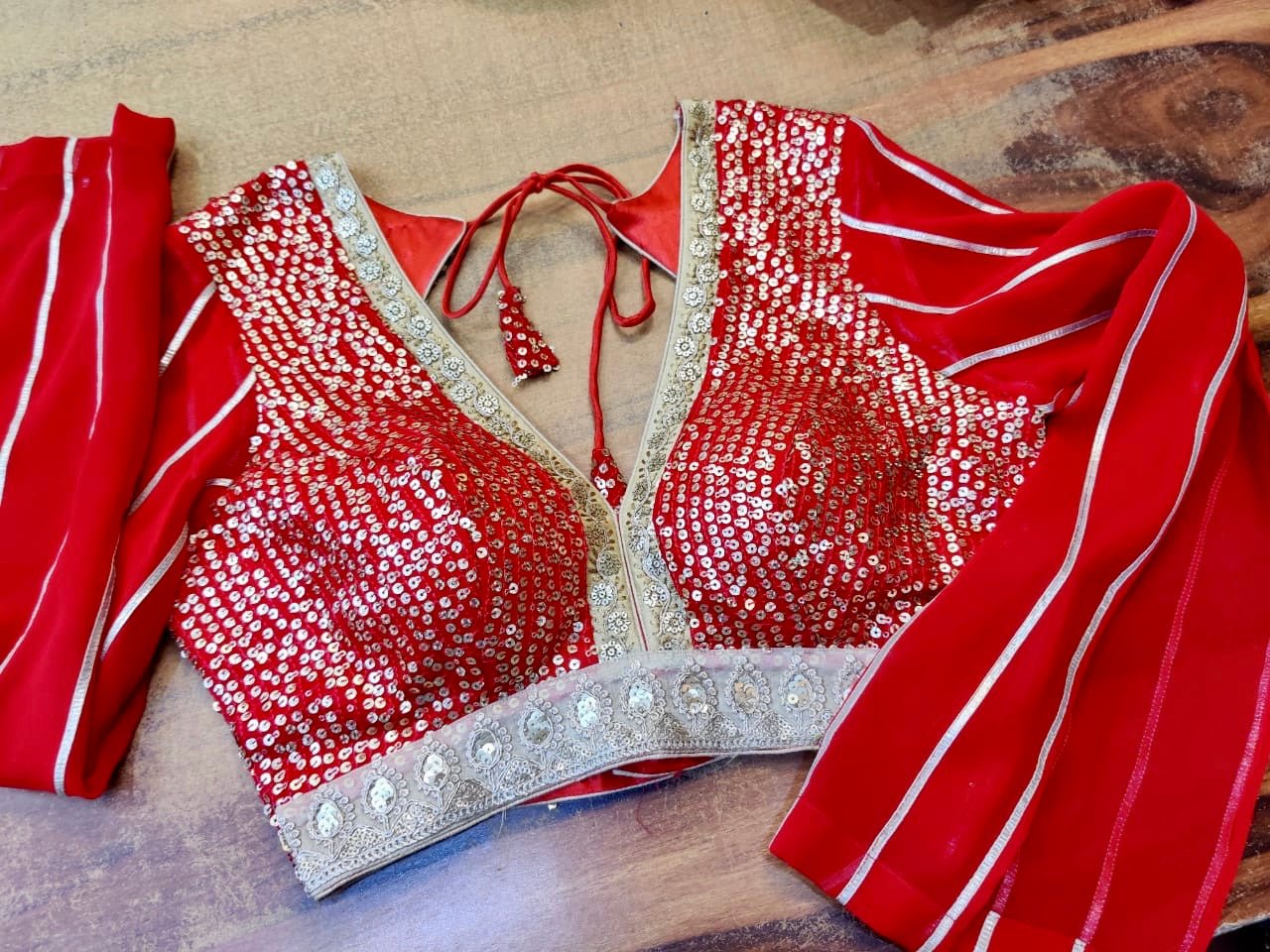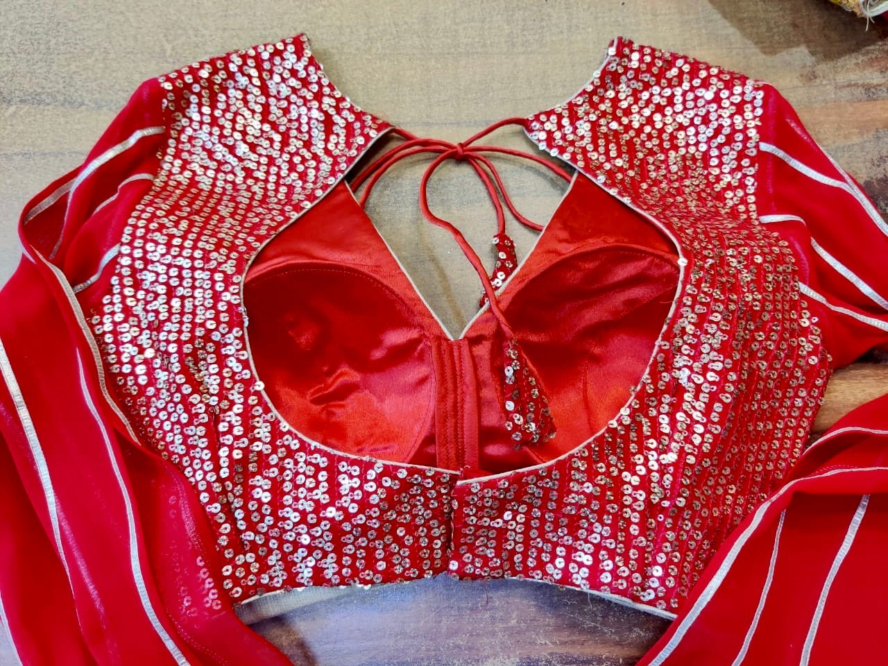 Stunning red sequin embroidery designer saree blouse. Buy online from Pure Elegance