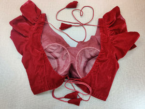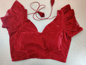 Stunning red velvet designer saree blouse with frill sleeves. Buy designer blouse in USA from Pure Elegance.