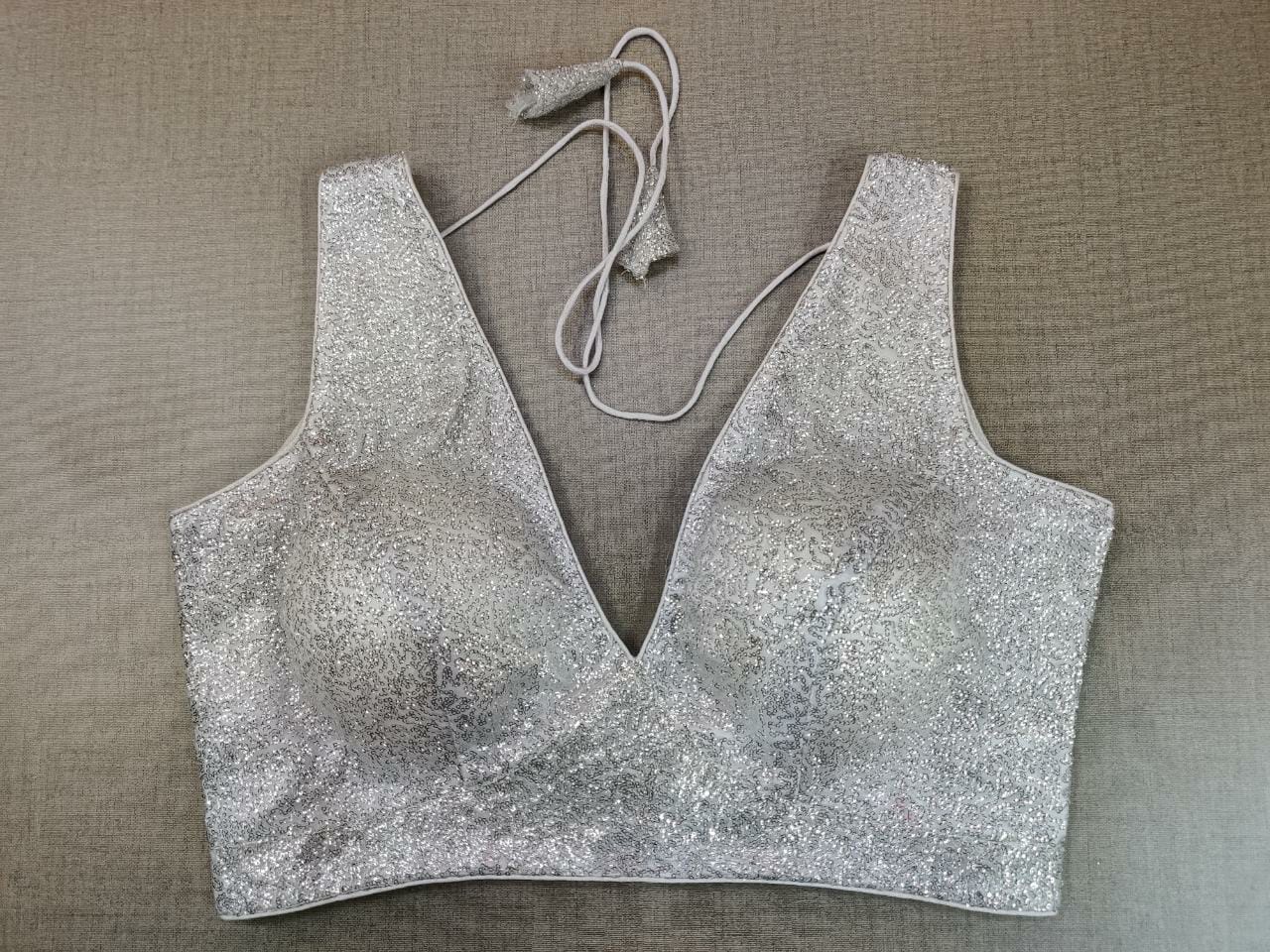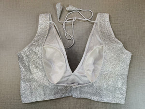 Gorgeous silver shimmer sleeveless sari blouse. Buy designer blouse in USA from Pure Elegance.