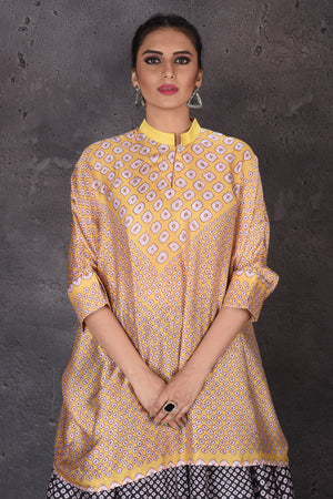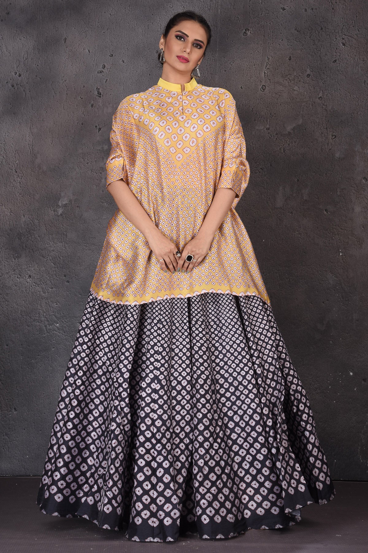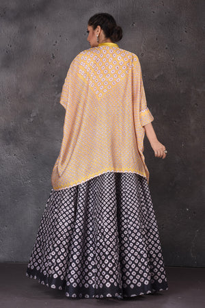 Look elegant at weddings and festive occasions in this beautiful yellow and black Bandhej skirt set. Shop designer lehengas in USA from Pure Elegance.