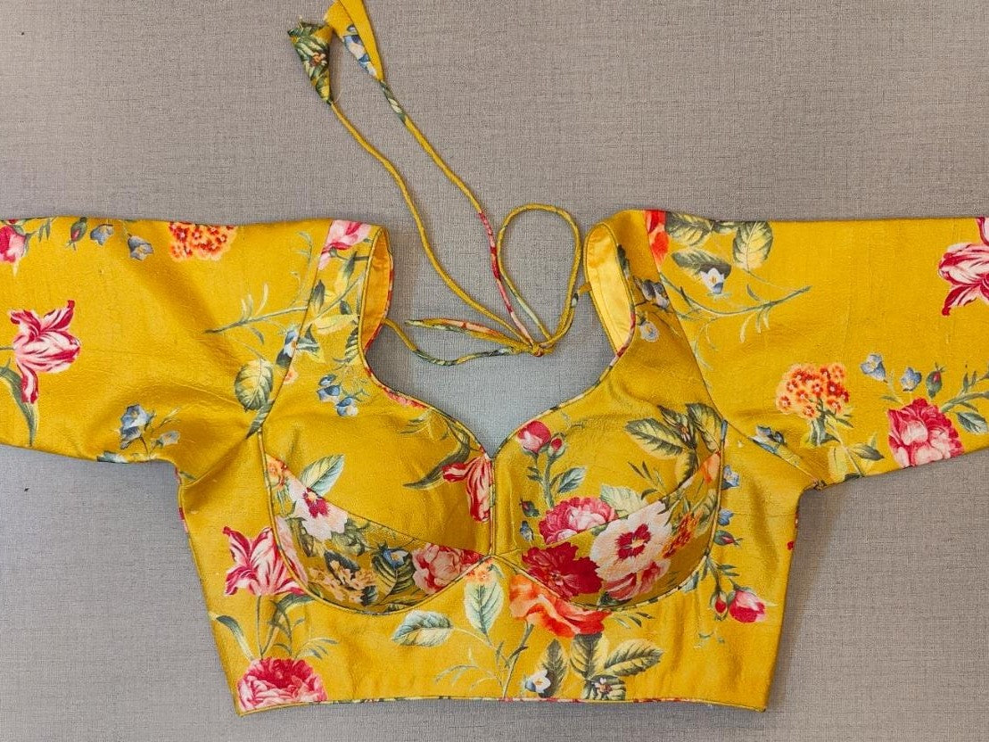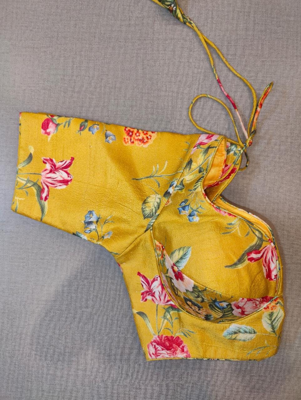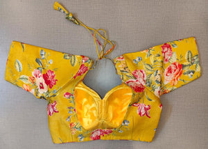 Stunning yellow floral print choli-cut saree blouse. Buy designer blouse in USA from Pure Elegance.