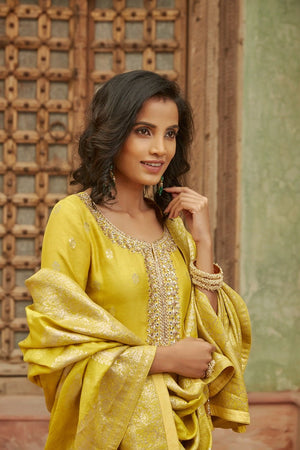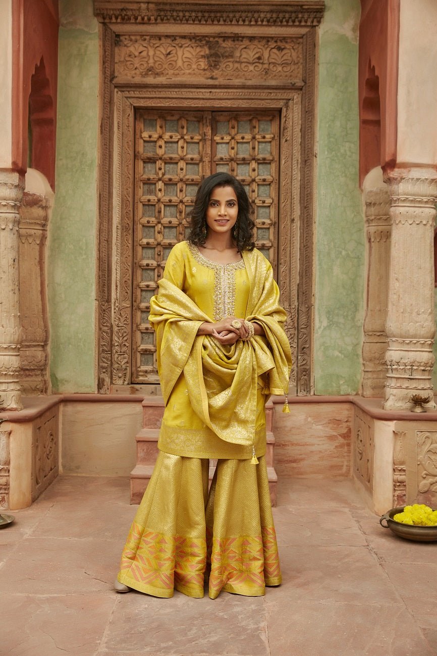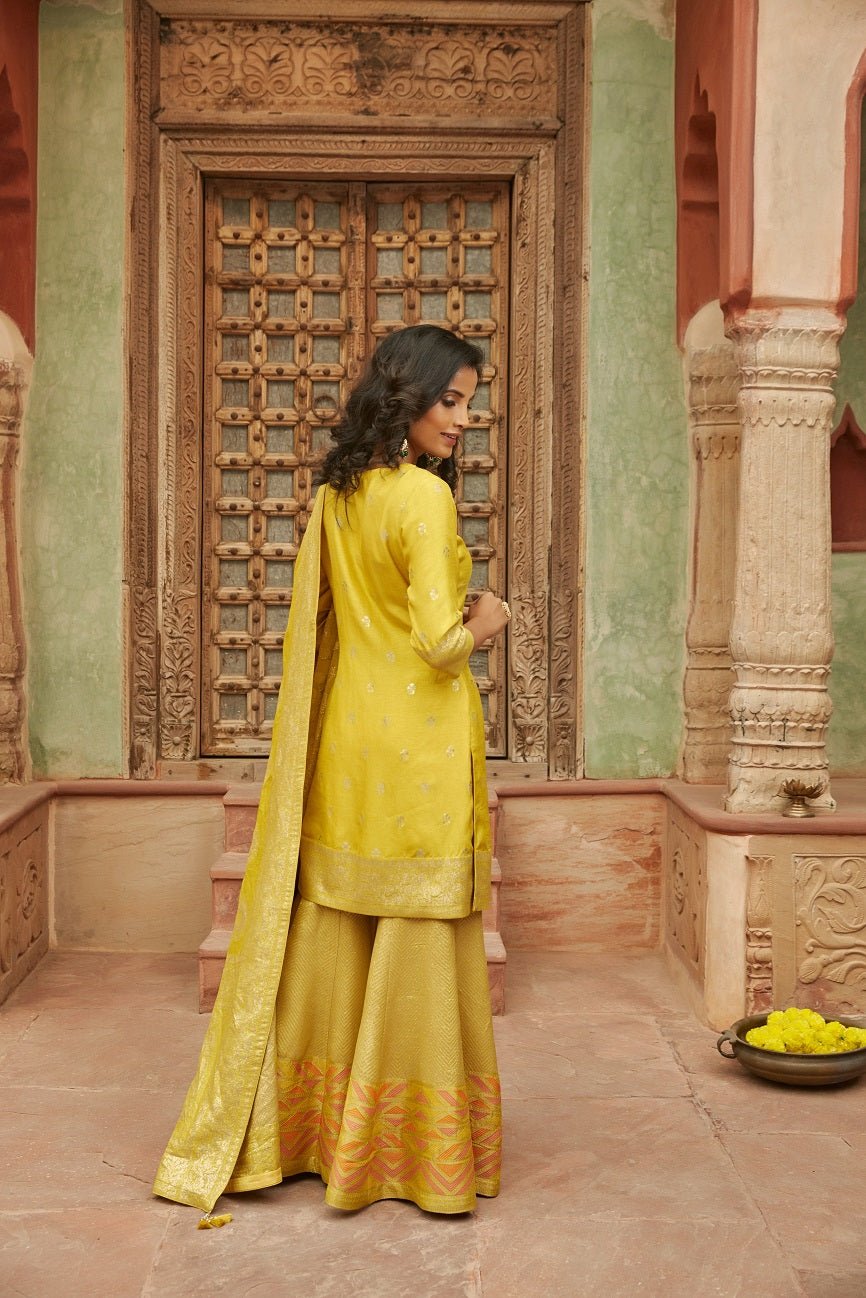 Stunning yellow mirror embroidery Banarasi sharara suit with dupatta. The suit is a perfect choice for weddings, sangeet and mehendi. Buy online from Pure Elegance