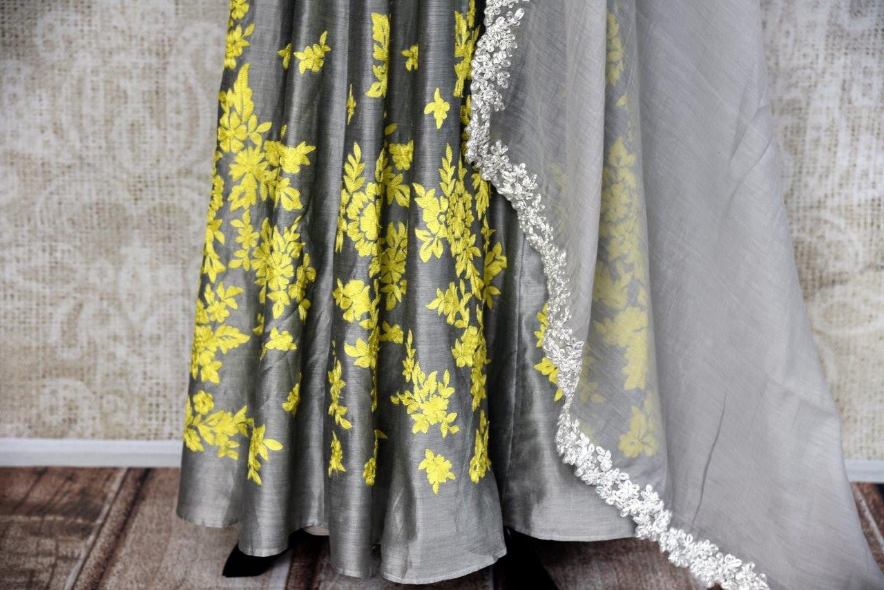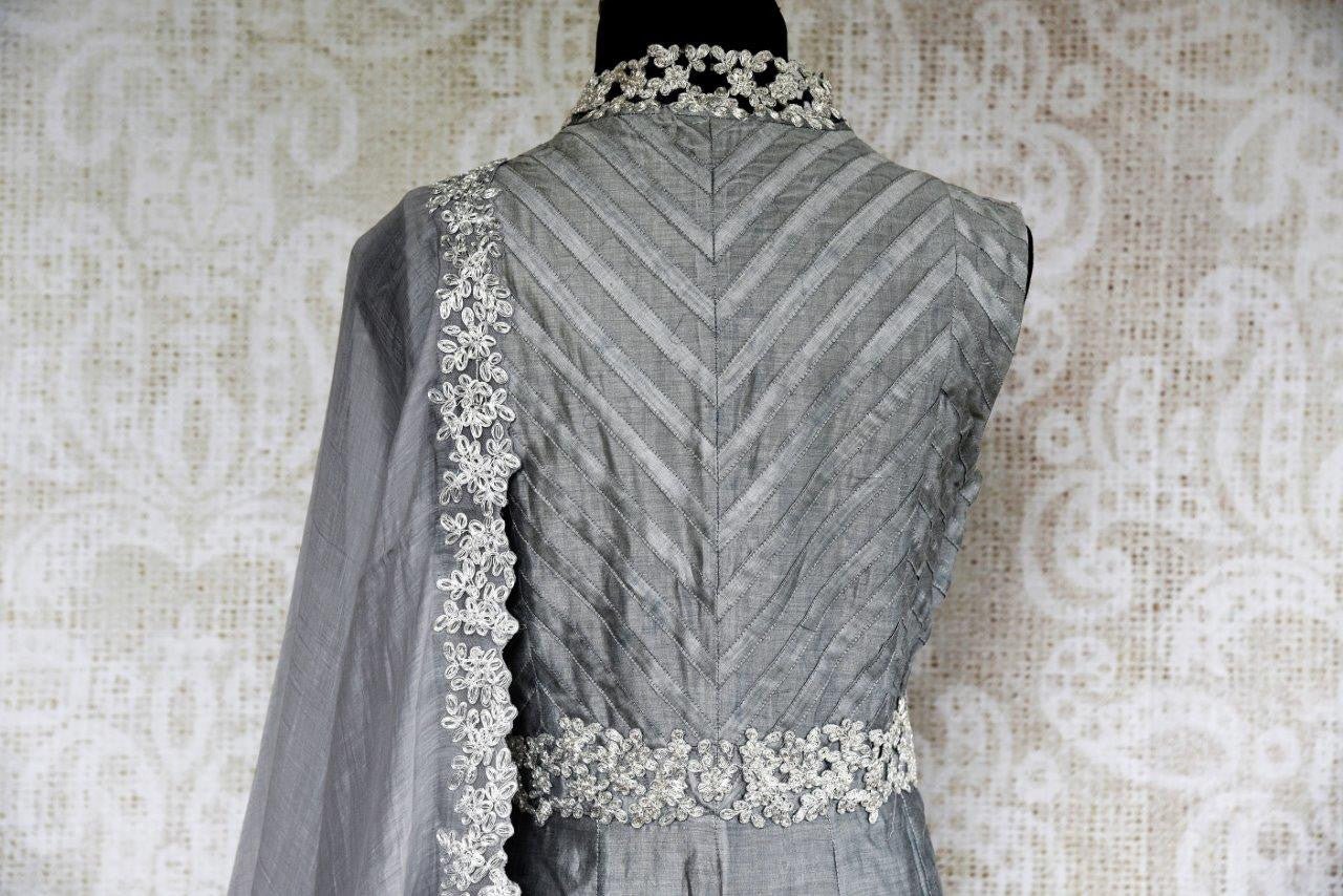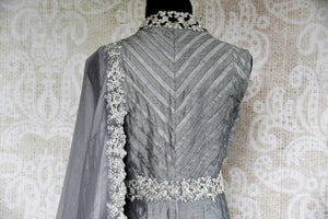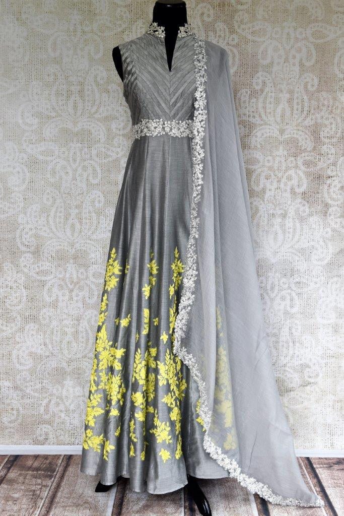 Stylish grey Anarkali suit with embroidery will be an exclusive piece in your ethnic wardrobe. The suit has a bright pop of colors with yellow thread embroidery on the panel. The bodice is designed with an interesting stripe pattern and silver embroidery. It comes with an embroidered dupatta. Perfect pick for festivals and parties. Buy online from Pure Elegance in USA!
