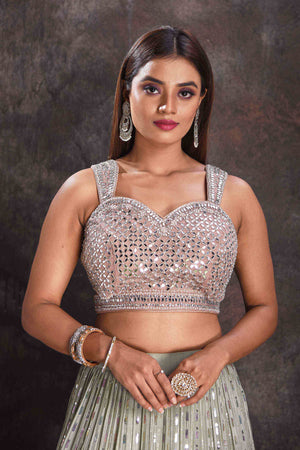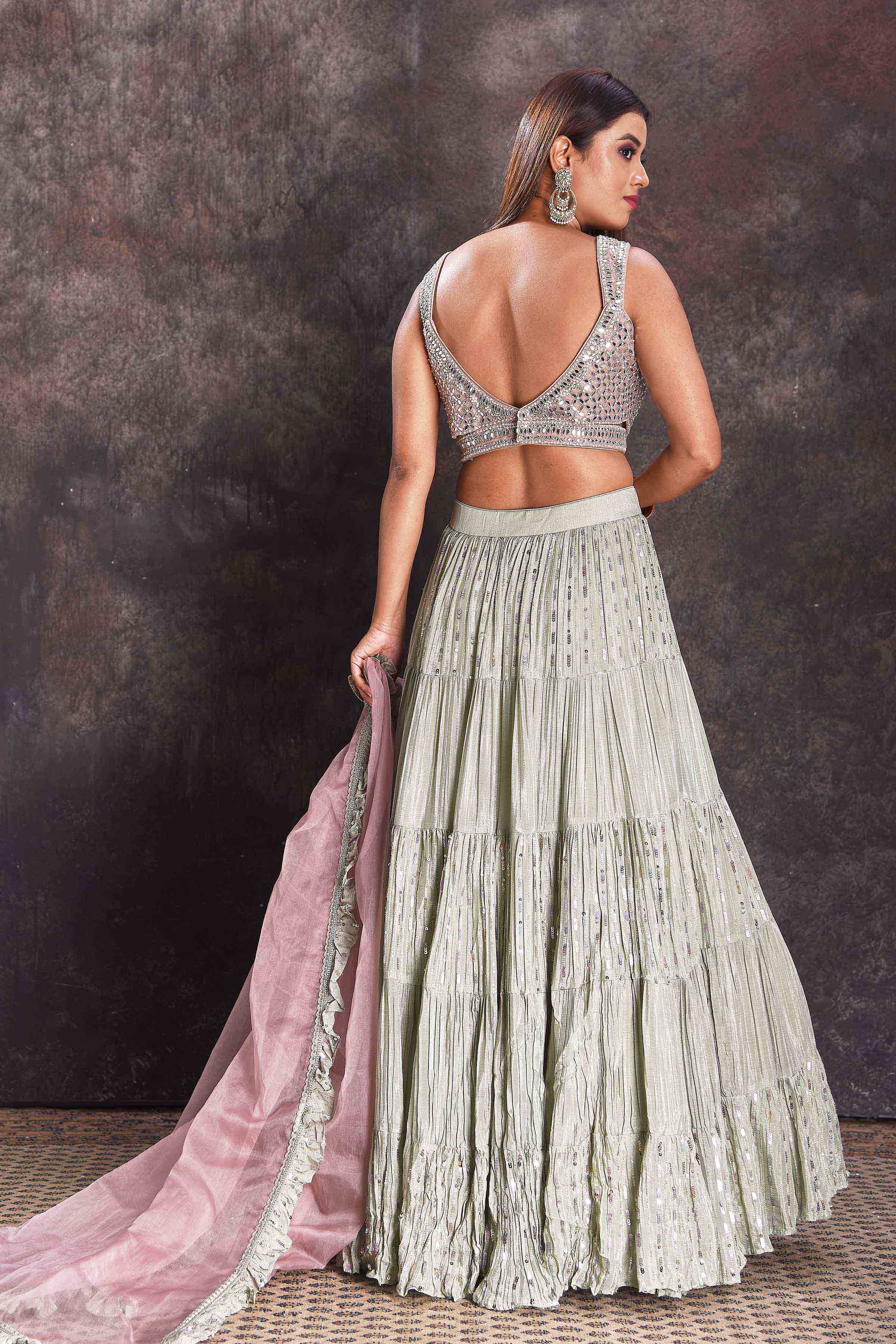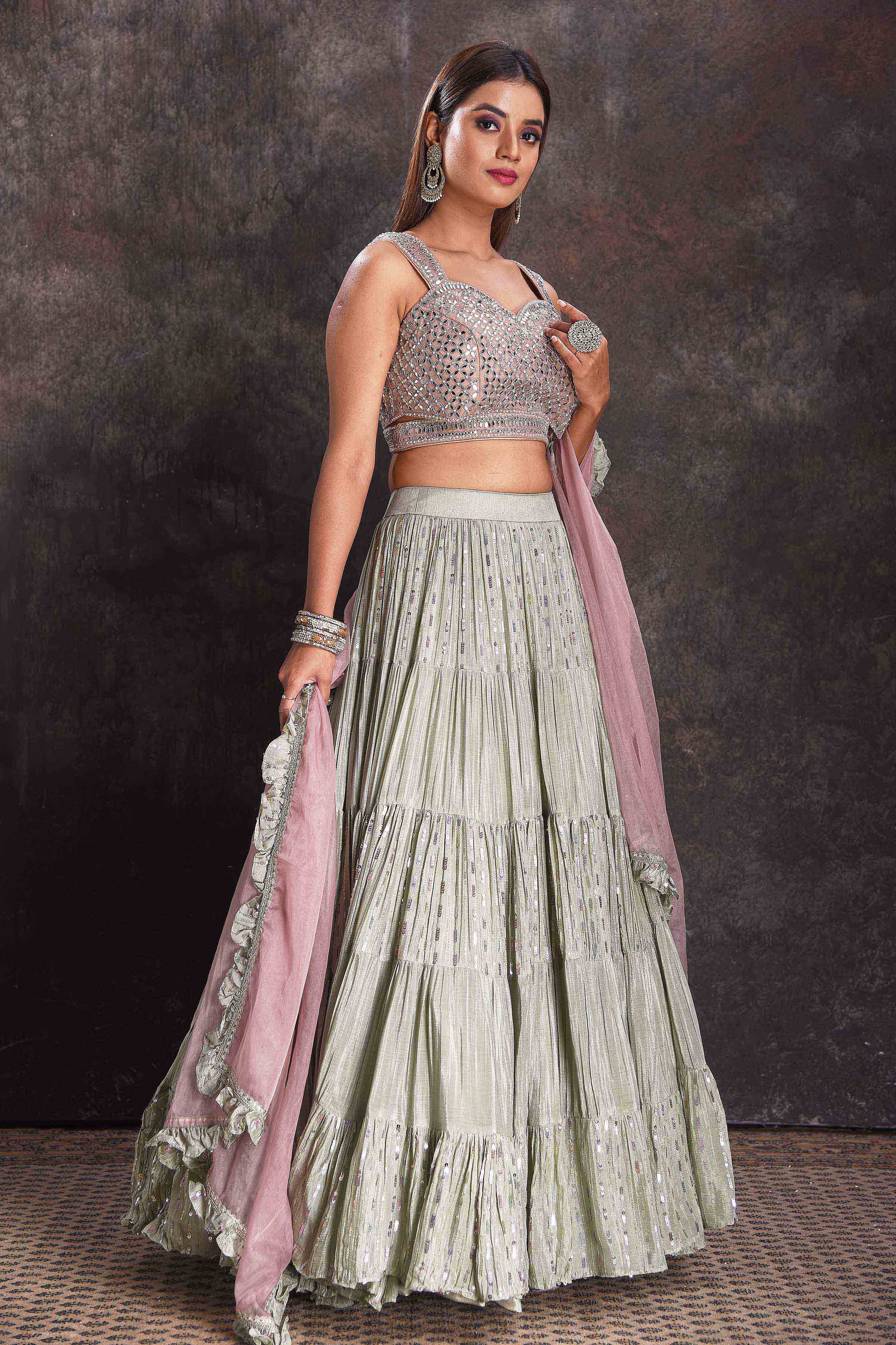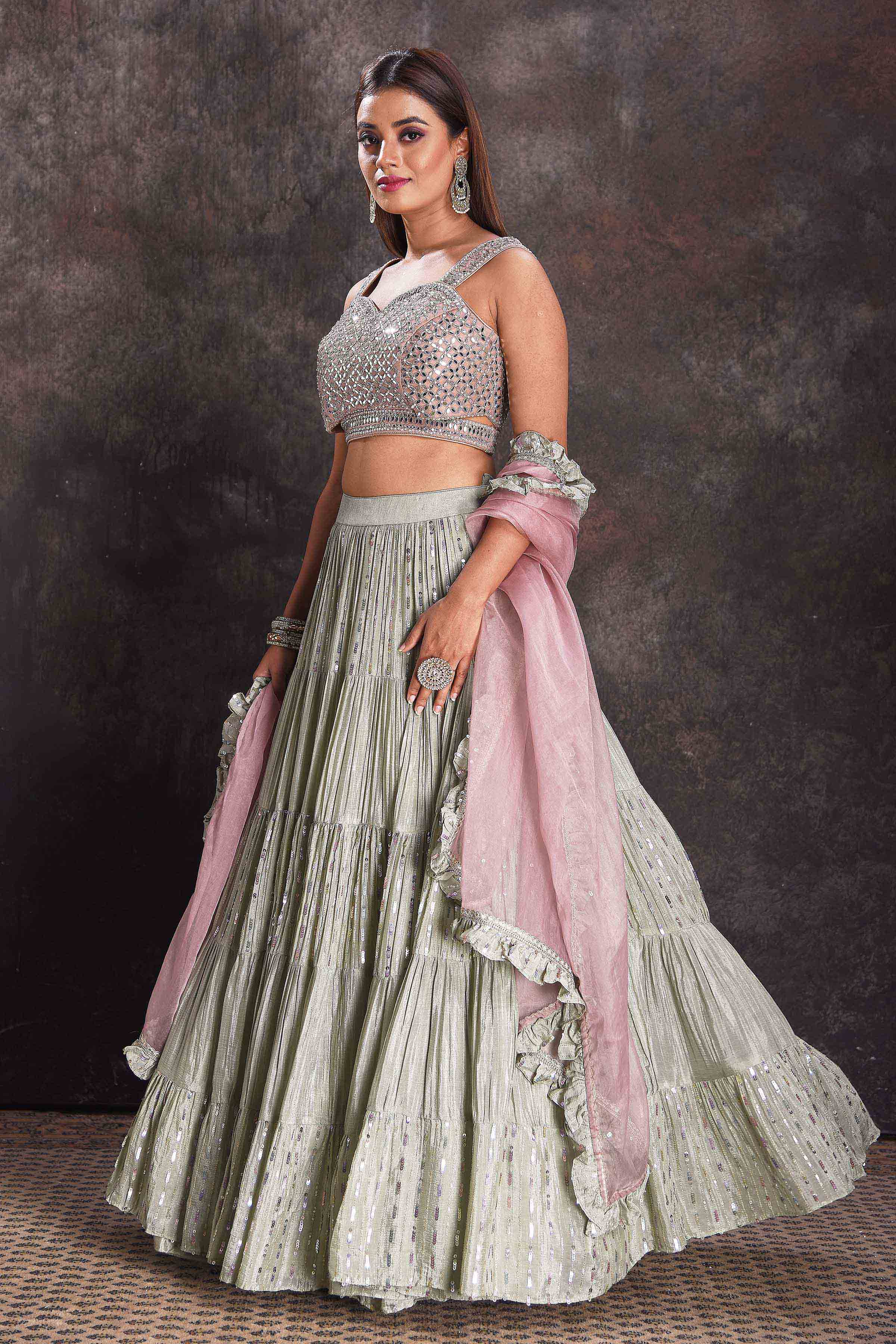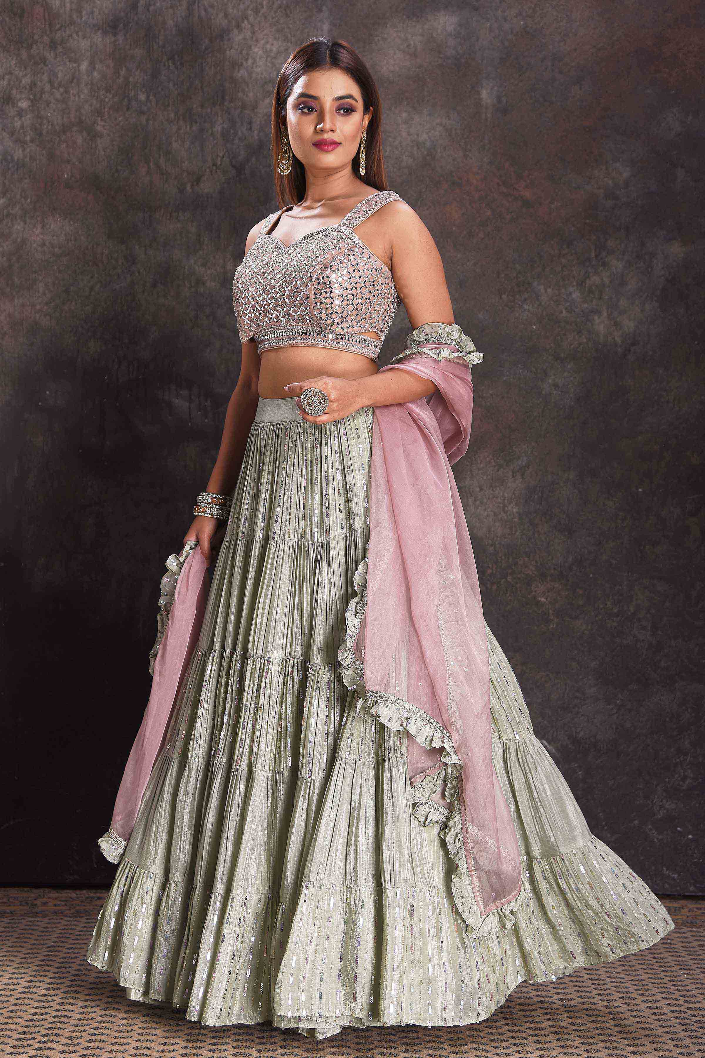 Get set to dazzle at cocktail parties and sangeet night in this tea green sequin pearl embroidery lehenga. The lehenga comes with a light pink dupatta.