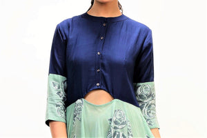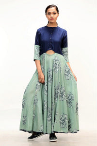 Look captivating in this teal color Jamdani maxi dress with woven rose floral motifs by Sayantan Sarkar. The dress has navy blue bodice and sleeves and cutout details on the waistline. Shop online from Pure Elegance or visit our store in USA.