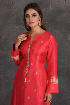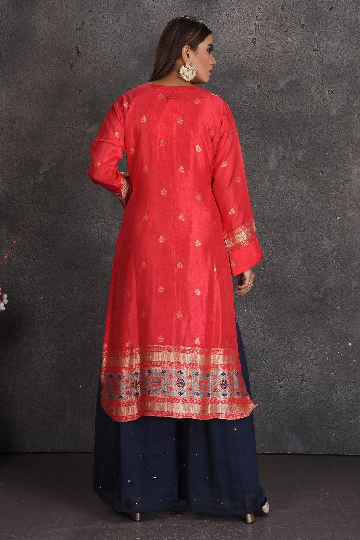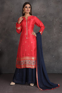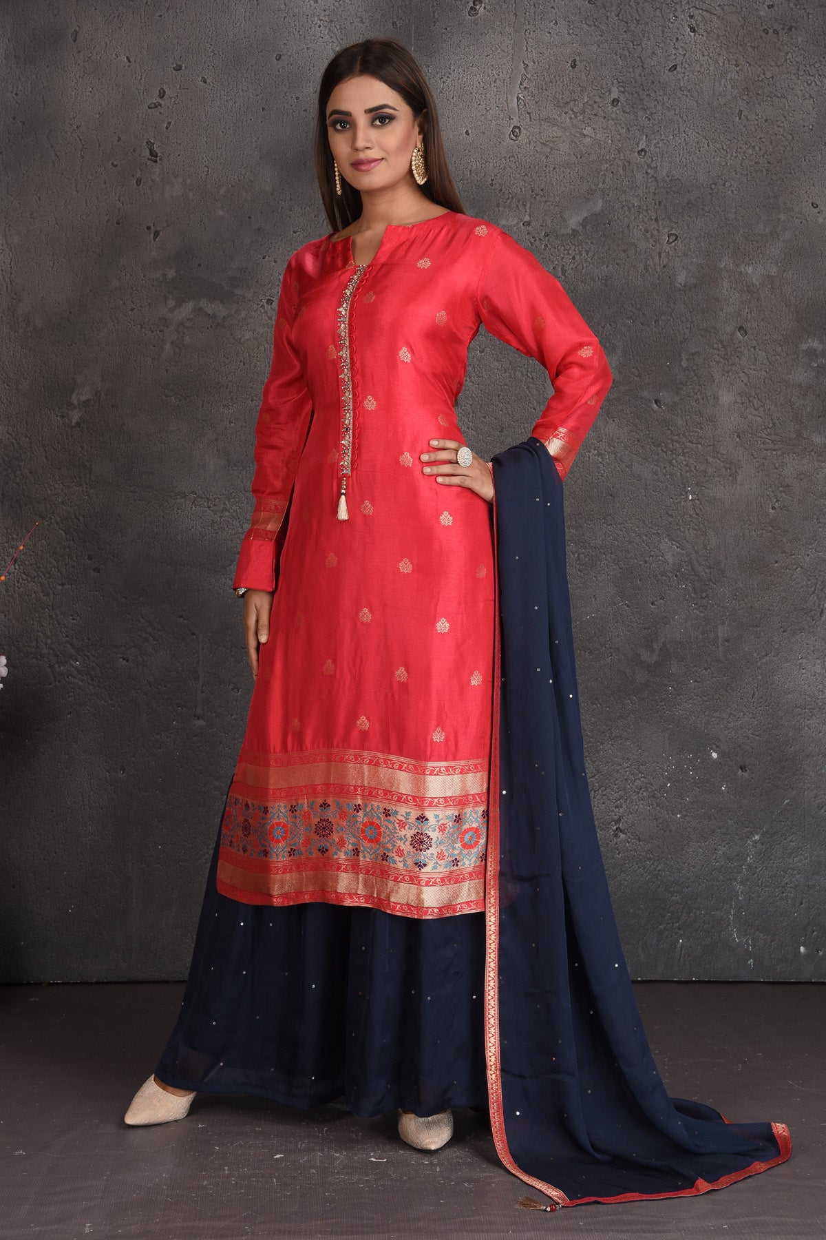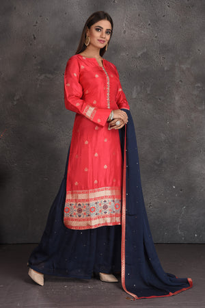 Set a fashion statement at parties in this beautiful tomato red and blue palazzo suit with dupatta. The suit has delicate embroidery and scattered zari buta and border. Shop designer dresses in USA from Pure Elegance Indian fashion store in USA.