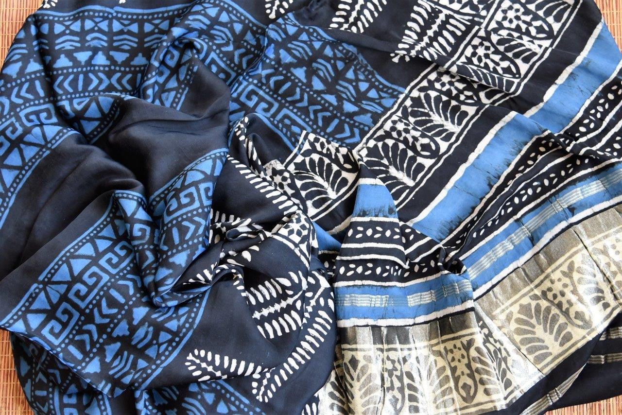 Traditional blue Gajji silk Ajrak print dupatta is a perfect match to your Indian suits. It has a silver border and a printed Ajrak design. A dupatta for a pure Indian ethnic style. Buy online from Pure Elegance!