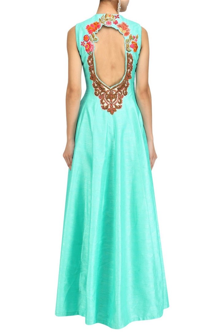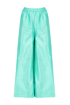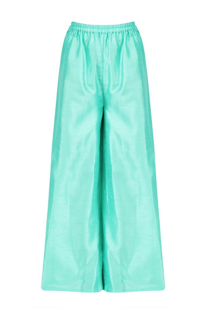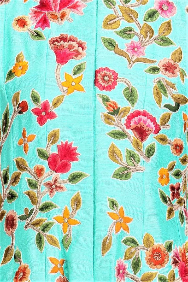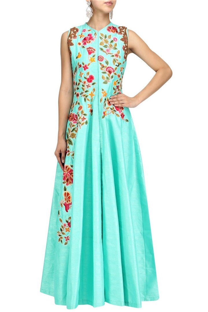 Turquoise blue with bright floral embroidered full-length jacket with palazzo pants is a stylish pick for parties! Shop online at Pure Elegance or visit our store in USA!