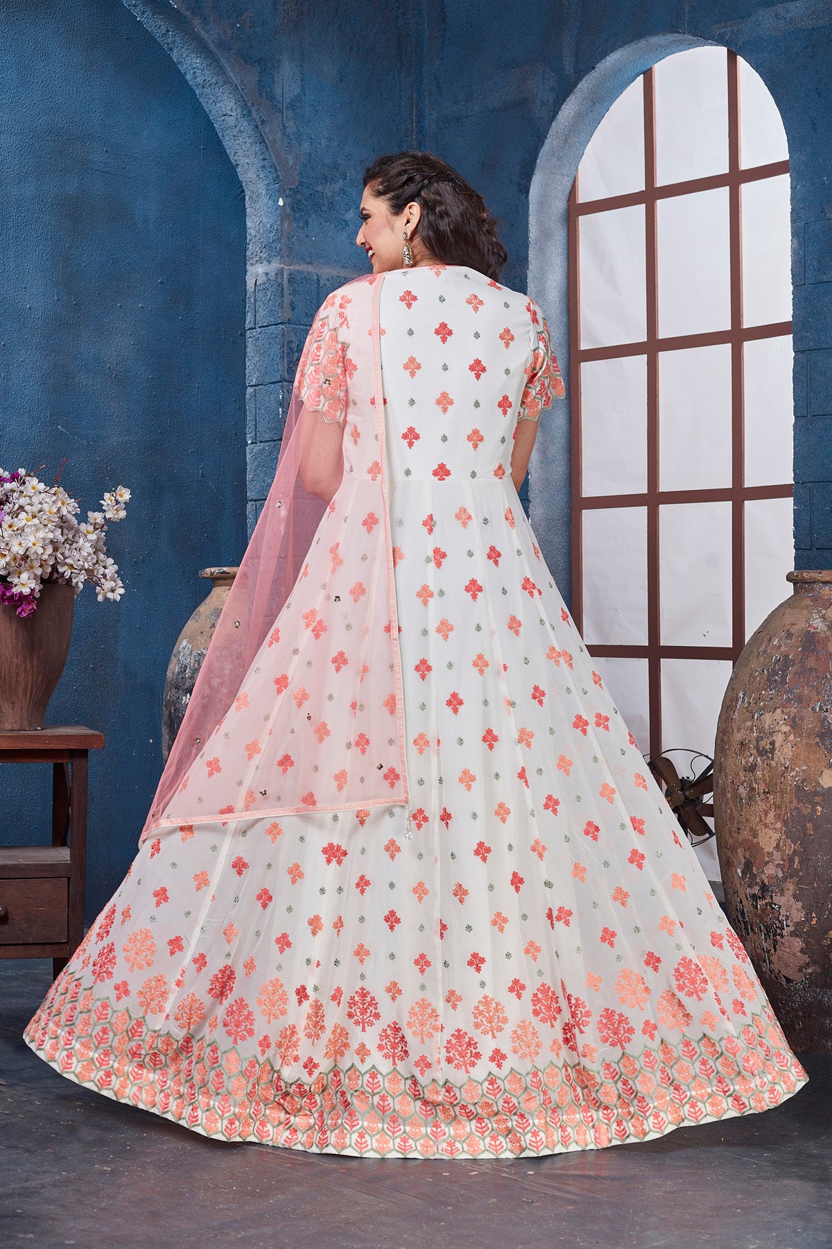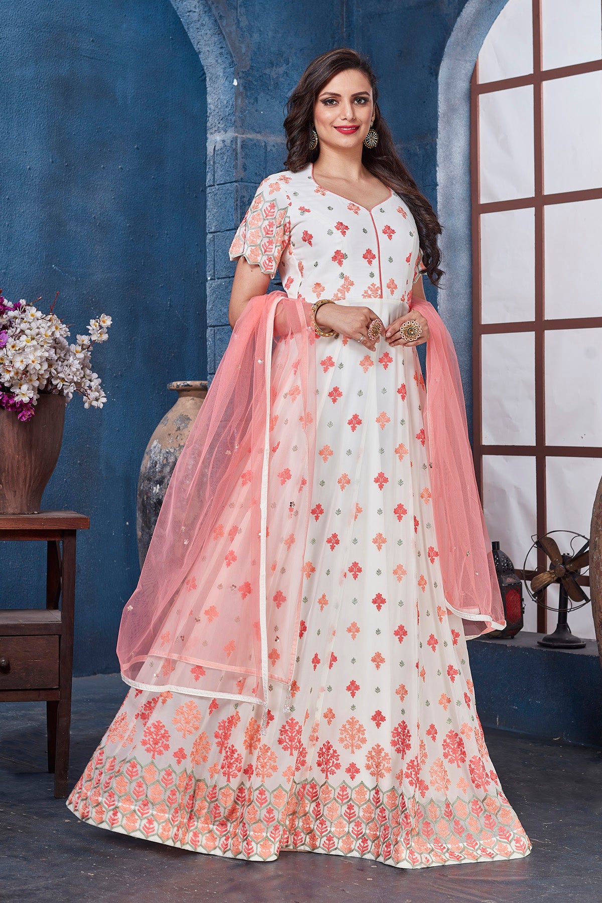 Get set to dazzle in this stunning white embroidered floorlength Anarkali with dupatta. The lehenga is perfect ensemble for wedding occasions and parties.