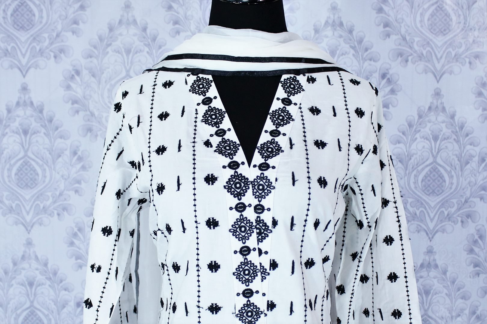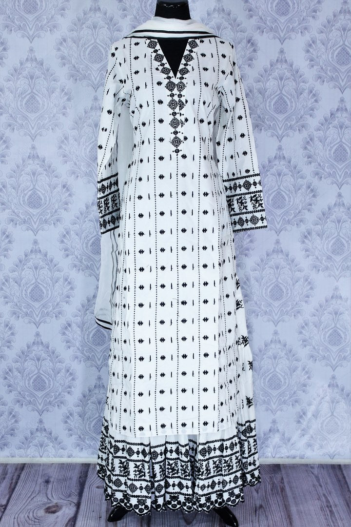 Classic white embroidered kurta with skirt for an ethnic Indian look at special occasions. It comes with a matching white dupatta. Buy online at Pure Elegance or visit our store in USA!