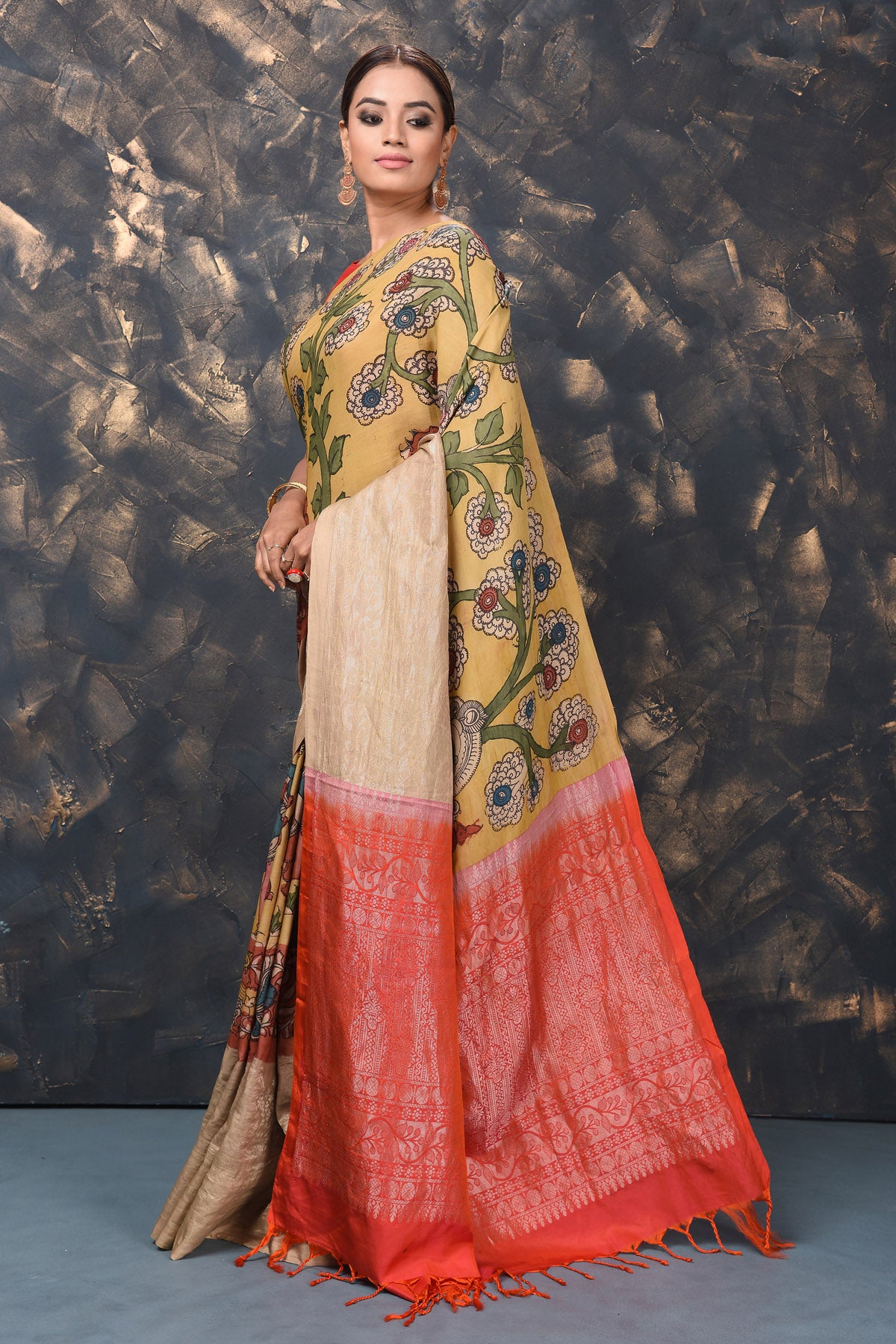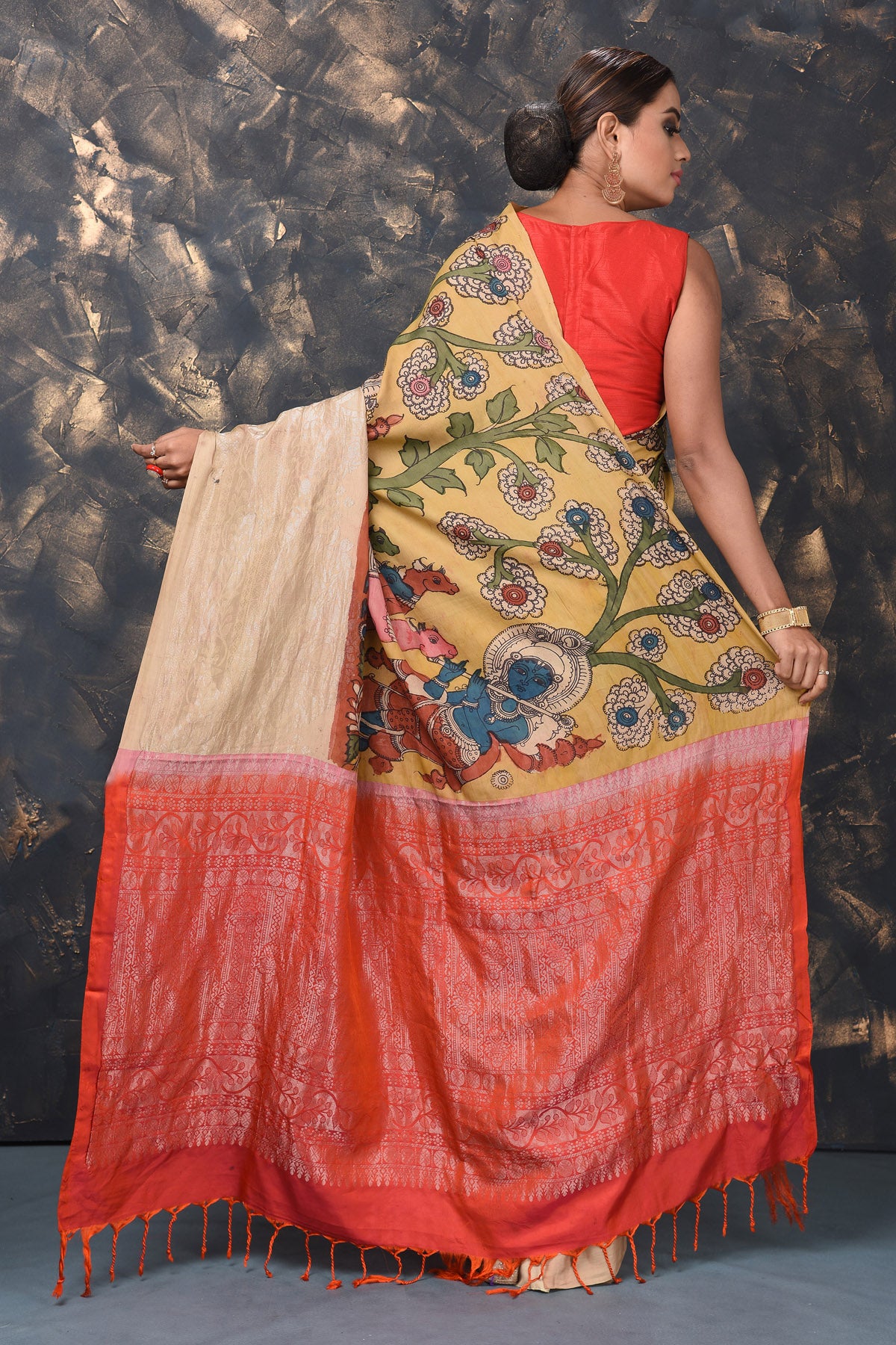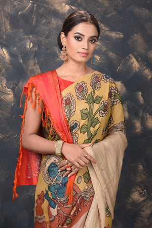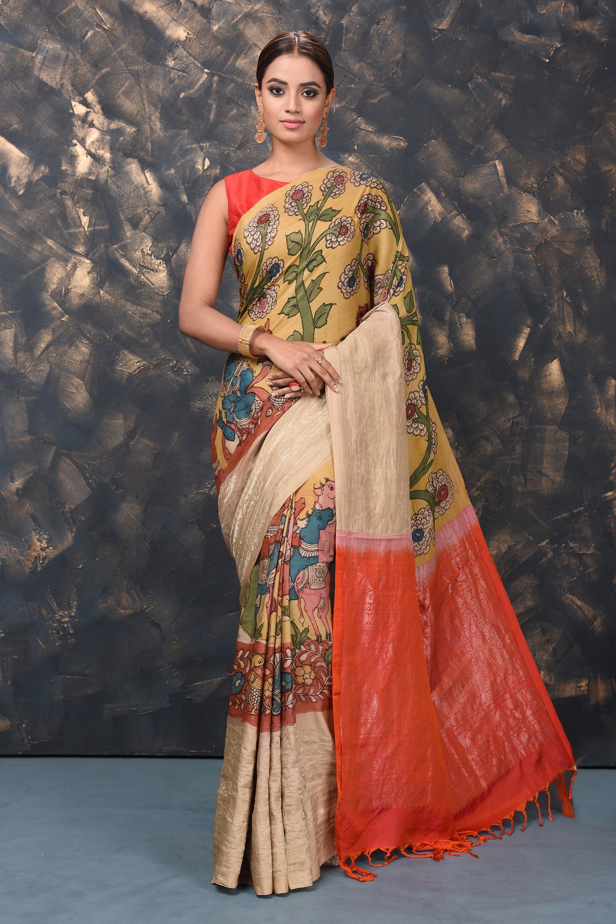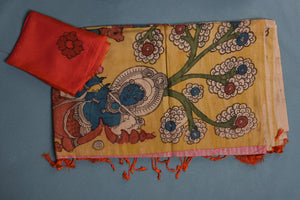 If you want a unique saree look, then this yellow Kanjivaram saree with pen Kalamkari print is perfect for you! The saree can be dressed up or down with accessories as per the occasion. It comes with a red blouse piece. Shop Kanjivaram saris in USA from Pure Elegance.