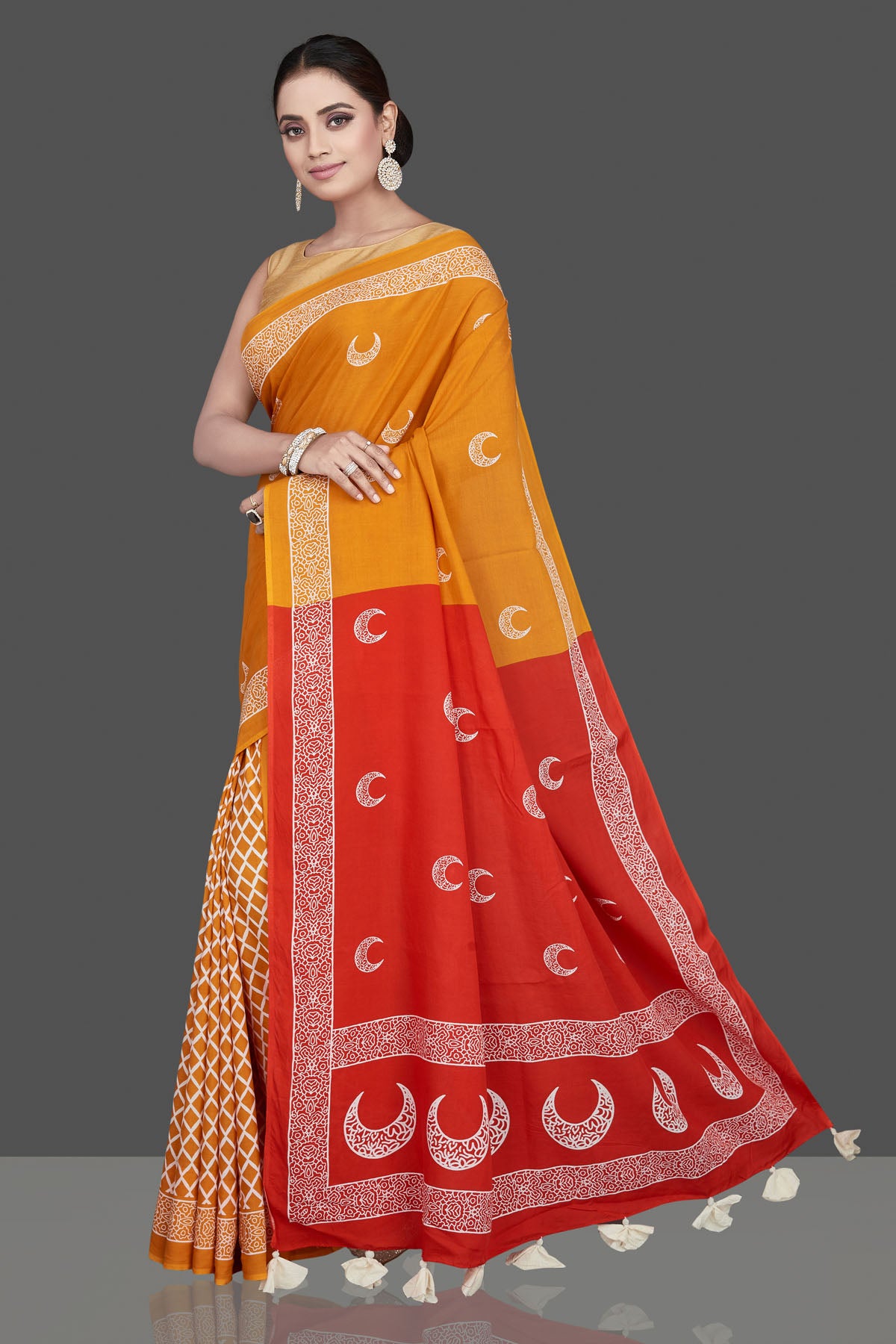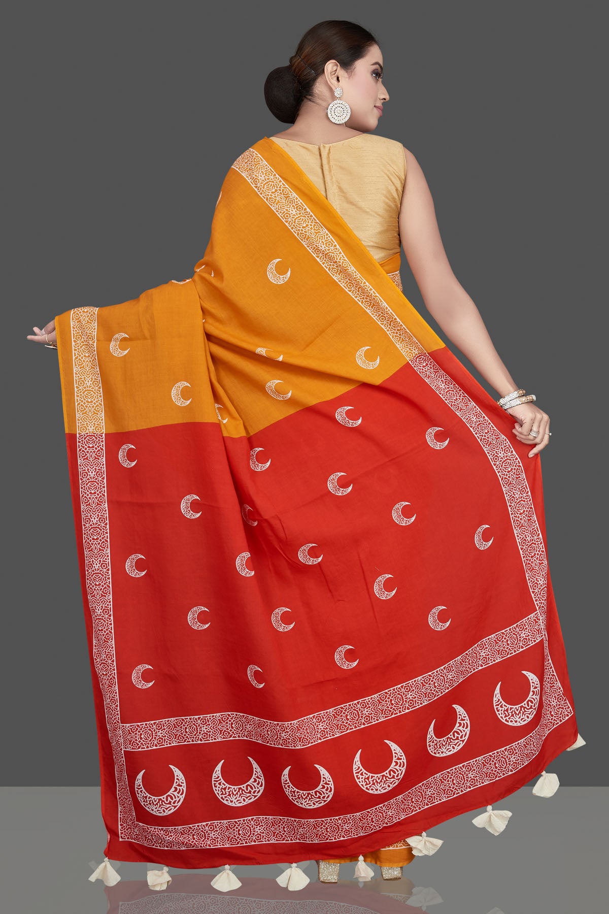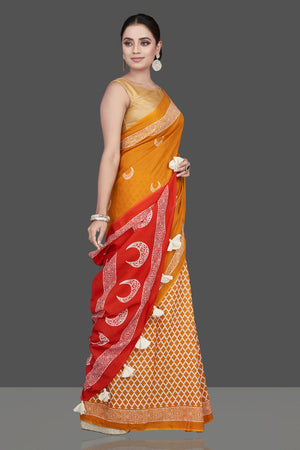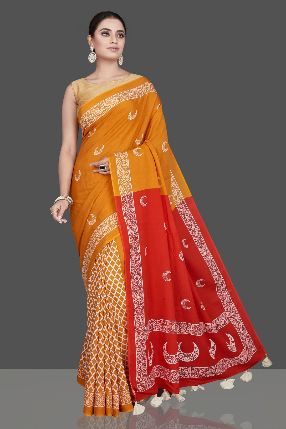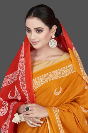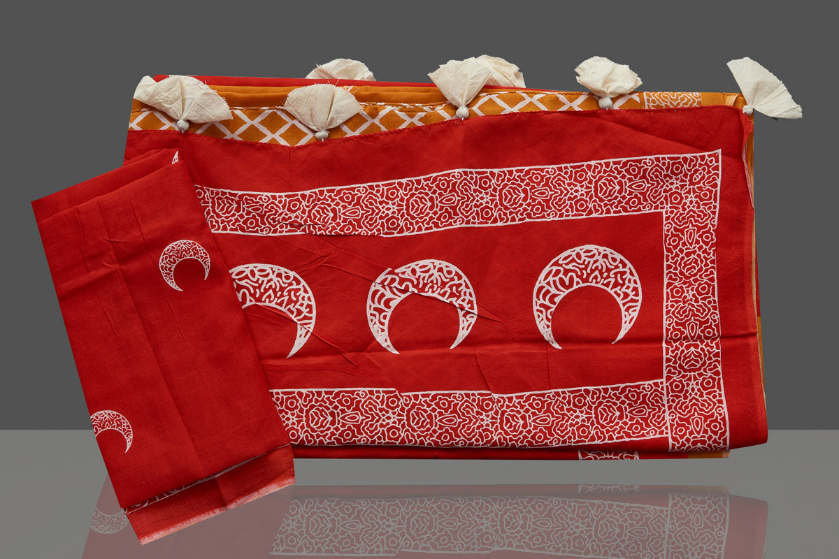 Stunning yellow printed modal silk sari with red pallu will make you the highlight of the occasion! It comes with a red blouse piece.