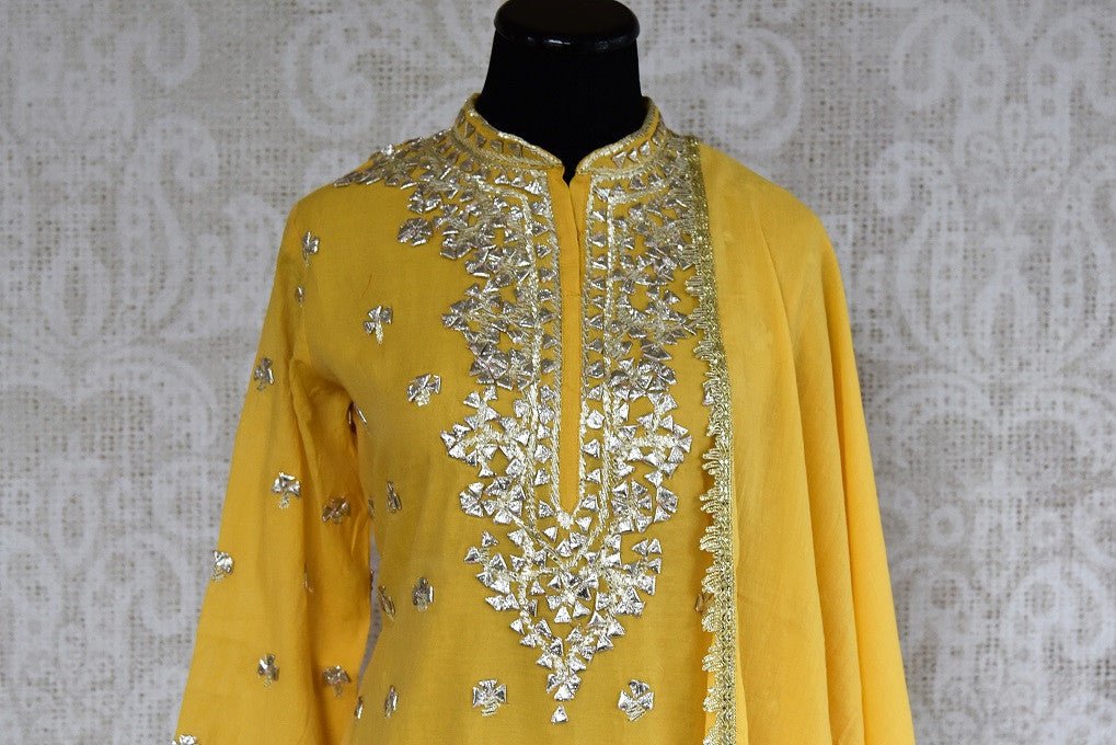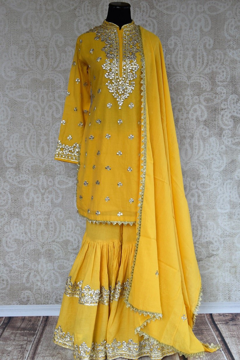 Enhance your wardrobe by purchasing this eye catching yellow silk sharara indian suit and dupatta embellished with gotta patti design work from pure elegance store and online. Great for parties and festive occasions.
