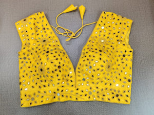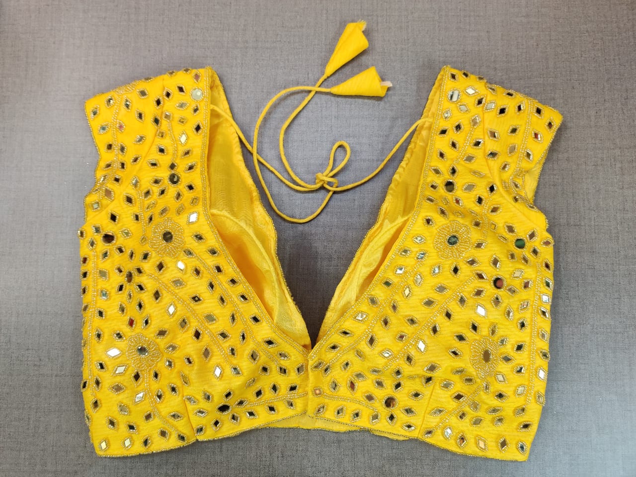 Beautiful yellow sleeveless saree blouse with mirror embroidery. Buy designer blouse in USA from Pure Elegance.