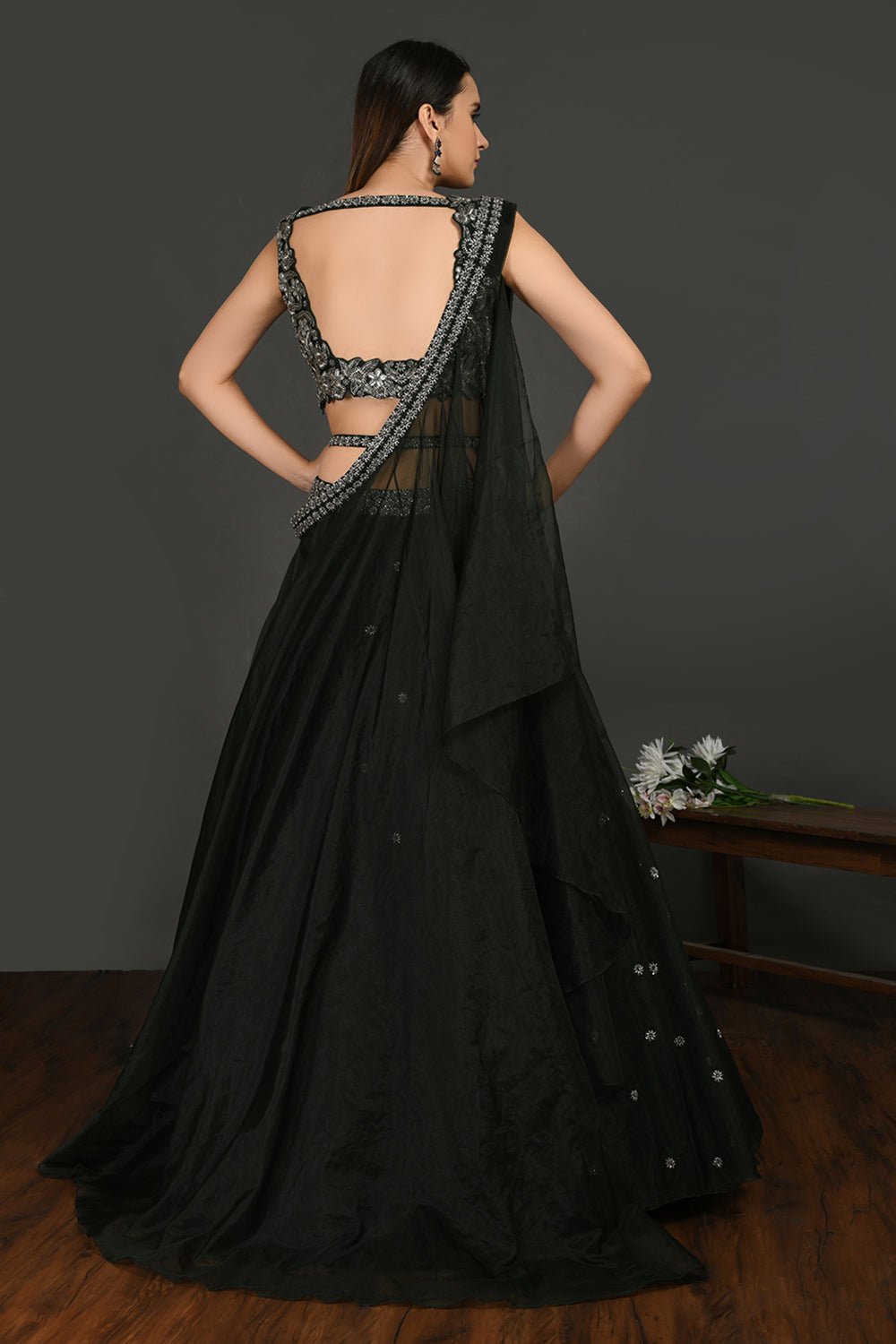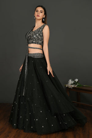 Beautiful black embroidered designer lehenga with dupatta perfect pick for festive occasions! Shop online from Pure Elegance.