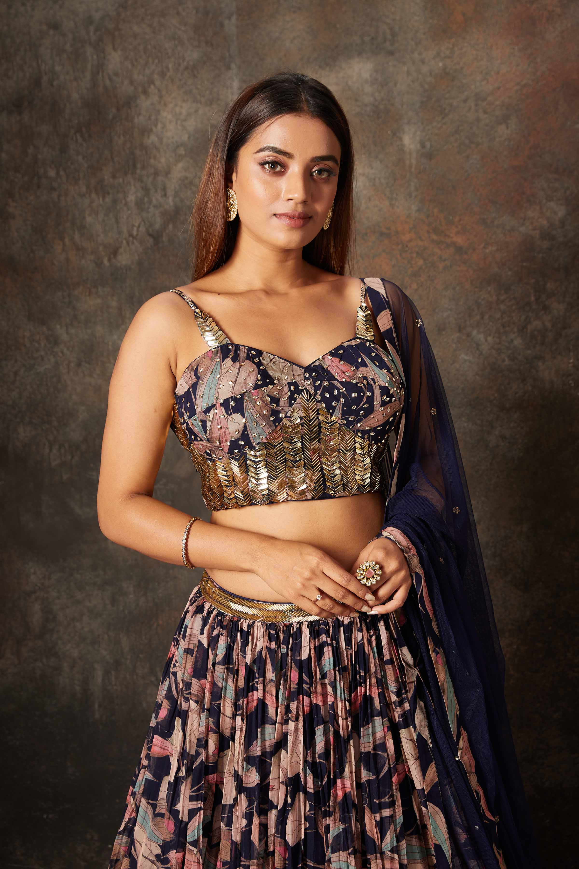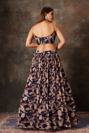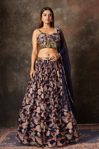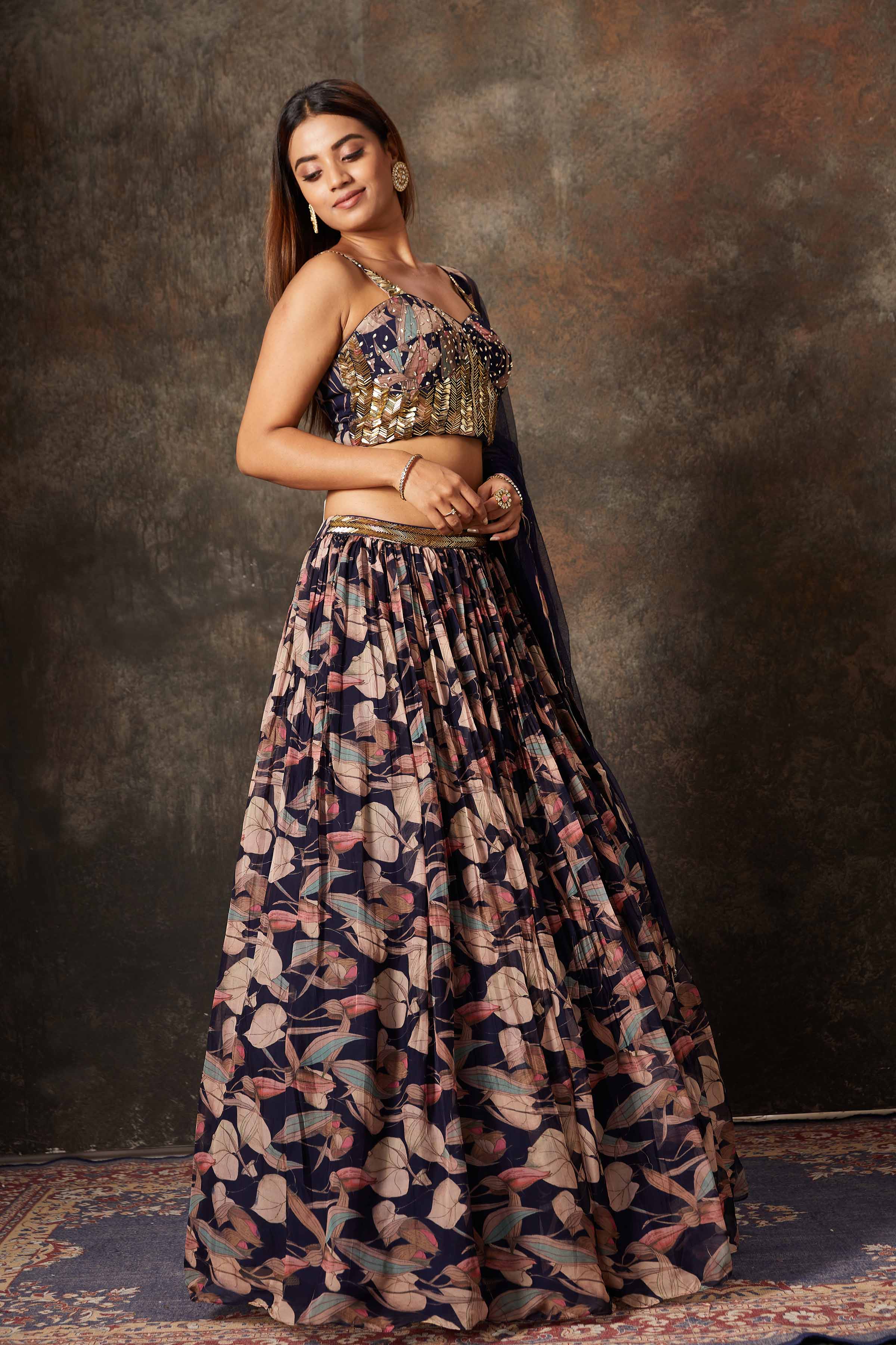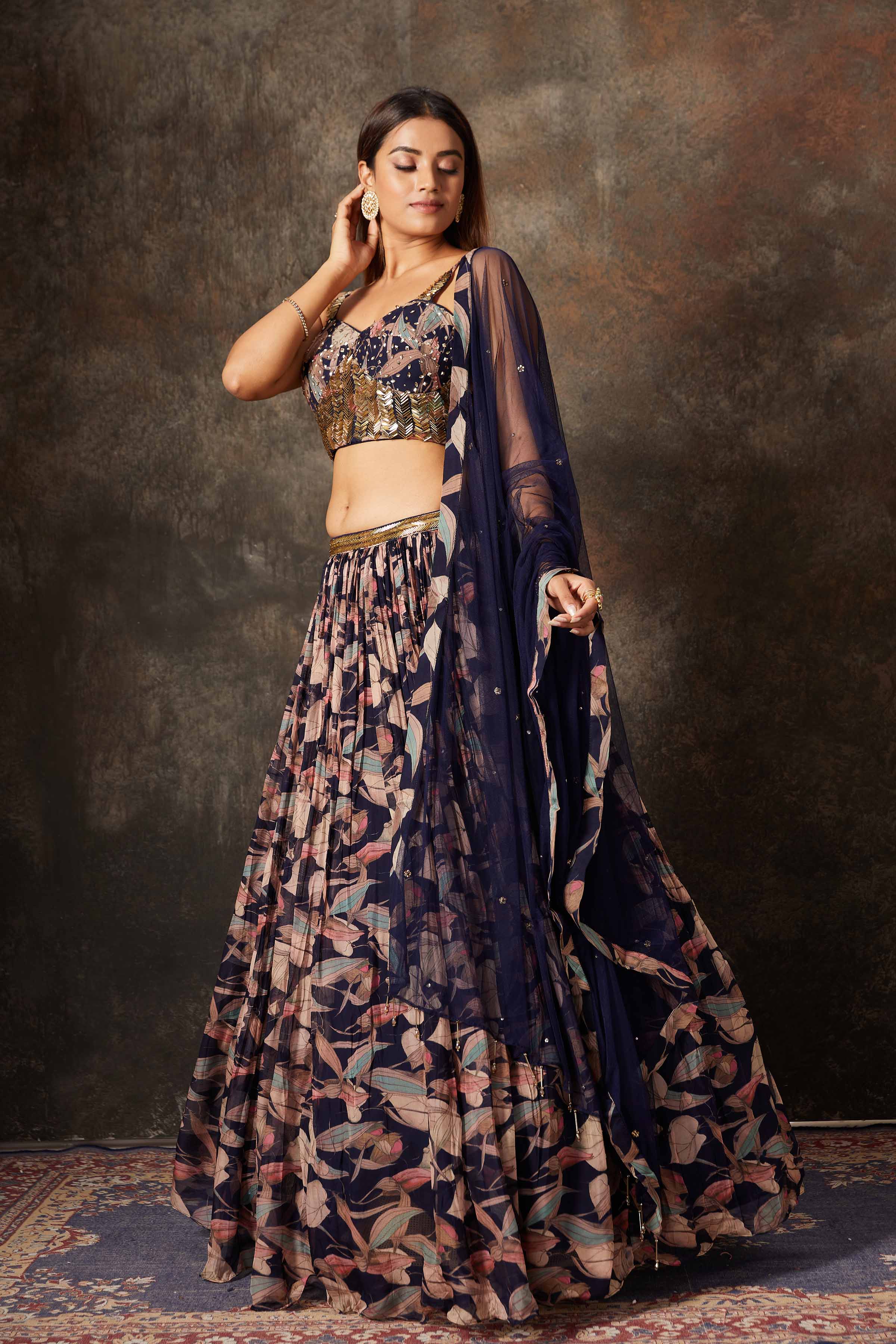 Look stylish at weddings in this beautiful dark blue printed and embroidered designer lehenga. Shop designer lehenga in USA from Pure Elegance.