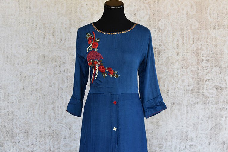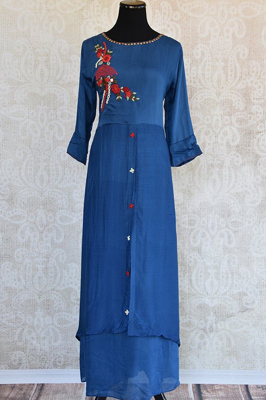 Cotton Silk Layered floor length dress in blue color with beautiful thread floral embroidery on bodice . Grab this Indian Casual wear.