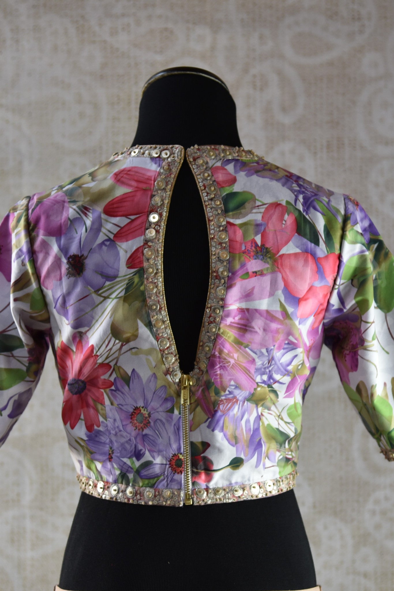 Refreshingly stunning with minimal work and a floral print, this blouse has a breezy and light vibe to it. The contemporary statement blouse has an interesting slit at the back that adds a sexy edge to the blouse.