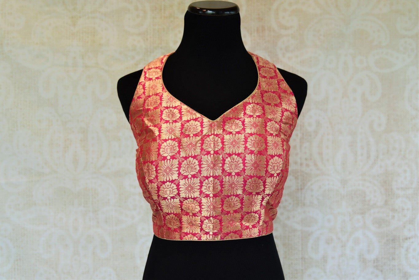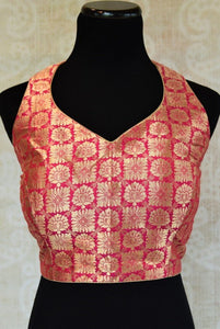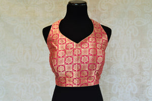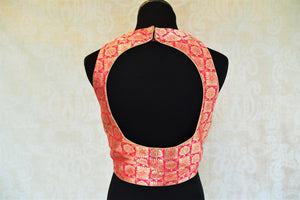 Pink and gold is as classic as it gets in Indian fashion. This designer blouse is magnificent in its every thread and weave and shines through beautifully without being overbearing. The round cut on the blouse provides an interesting edge to this otherwise sweet blouse.