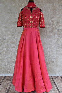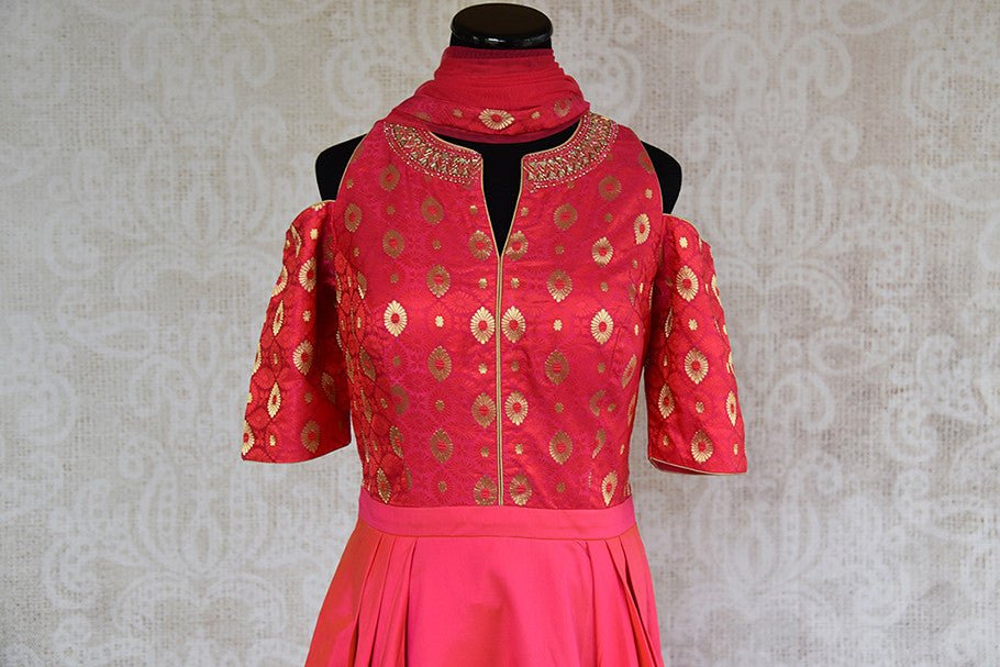 Buy pink anarkali suit with banarasi brocade bodice and solid skirt which has pleats both sides. Suit has cold shoulder and embroidered neck line and net scarf.