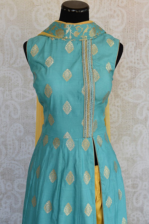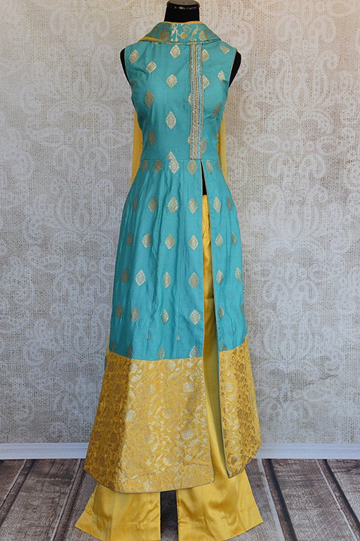 Green Indo western style banarasi silk suit with gold buta and yellow silk broad straight pants/palazzo and stone embroidery work on bodice comes with net dupatta.