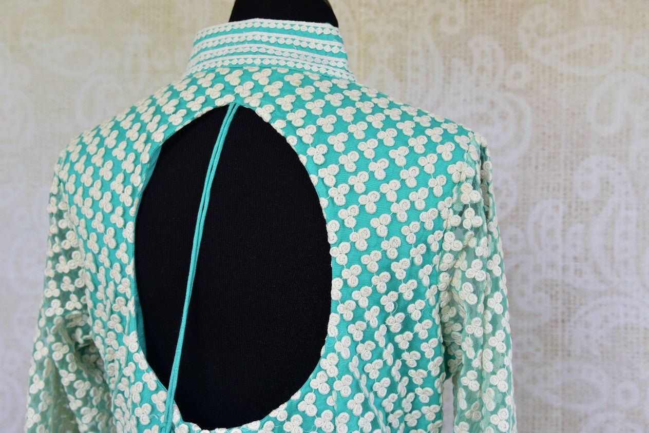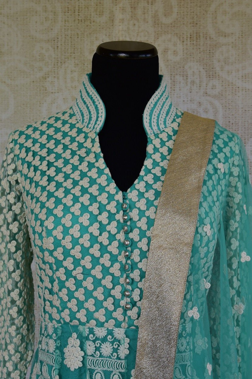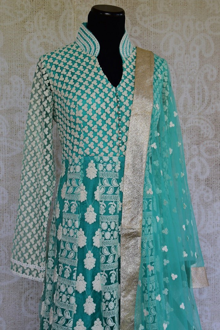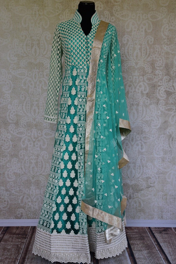 Green net with jaal thread embroidery anarkali. Gorgeous party wear suit perfect for Indian events.